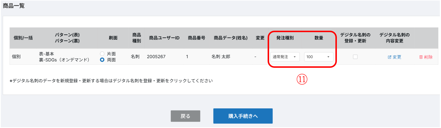 ⑪下記の画面が表示されましたら、名刺の新規作成は完了です。 続けて作成した名刺の発注を行う場合は、「発注種別」と「数量」を選択し、 「購入手続きへ」をクリックします。