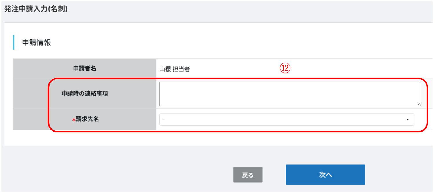 ⑫発注申請入力の画面が表示されますので、必須項目をすべて入力し、 「次へ」をクリックします。 ※サイト構築時の設定や運用方法によって、項目の仕様が異なる場合があります。 貴社の規定に沿って入力してください。 ※申請時の連絡事項は発注申請に伴い、貴社内の管理者、または承認者の方へ 連絡事項がある場合はこちらに入力してください。 山櫻側、および印刷会社や工場側では内容を確認することができません。 ※配送先で「直送指定」を選択した場合は、配送情報を入力する項目が別途表示されます。