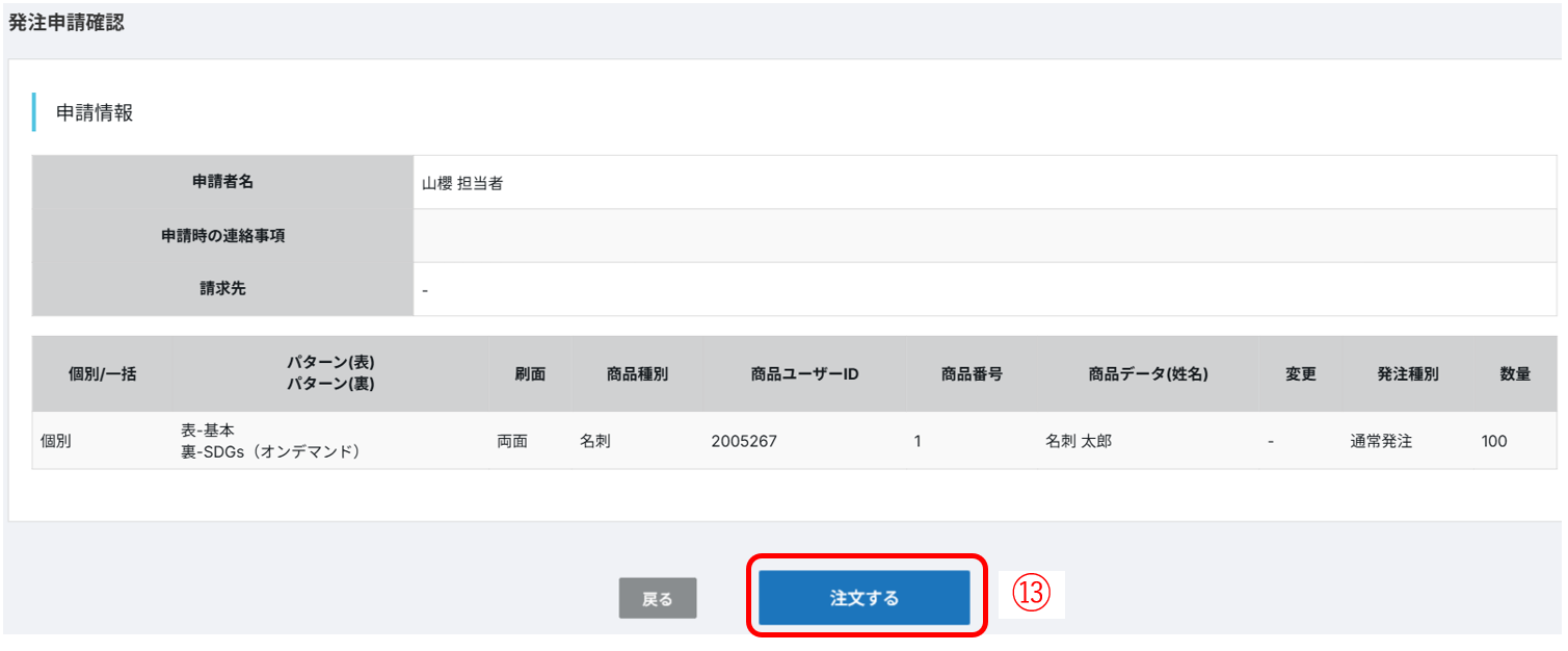 ⑬発注申請確認の画面が表示されますので、入力した情報を確認の上、「注文する」をクリックします。