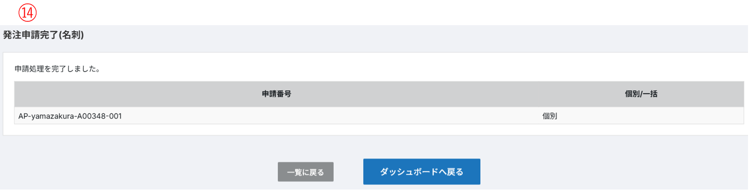 ⑭発注申請完了画面が表示されましたら、名刺の発注申請は完了です。 ※画面に申請番号が表示されますが、こちらは名刺の発注申請が完了すると 自動で割り振られる番号です。発注履歴の確認などの名刺管理にご活用ください。 申請番号はホーム画面の「発注履歴を見る」から確認することができます。