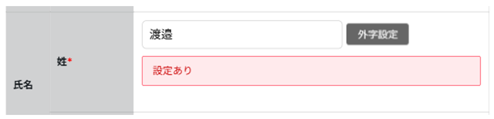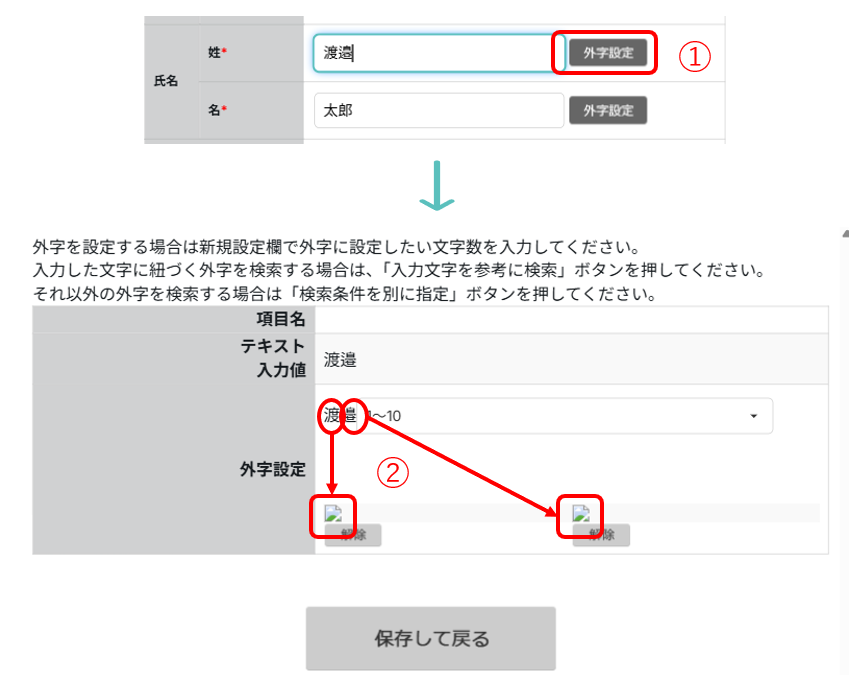 ▼操作例 姓を“渡邊”とし、“邊”の外字設定を行う場合 ①編集画面の氏名欄に表示されている「外字設定」ボタンのうち、 設定が必要な項目のボタンをクリックします。 ※姓/名の両方で外字を使用する場合は、それぞれ個別に設定を行ってください。 ②テキスト入力値に表示されている漢字のうち、外字設定が必要な漢字に対応している 「検索」をクリックします。 今回は“邊”の外字設定を行うため、右側の「検索」をクリックします。 ※外字設定はテキスト入力値の文字数に合わせて、「検索/解除」ボタンが表示されます。 今回の例の場合、テキスト入力値の文字数は2文字(渡邊)であるため、 「検索/解除」ボタンも2個表示されています。 テキストと「検索/解除」ボタンは左から順番に1文字ずつ連動しており、 左から1番目、2番目...とカウントします。