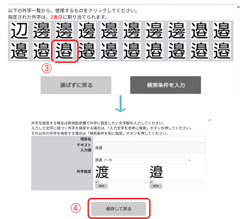 ③フォントが対応している外字の一覧が表示されますので、該当する漢字をクリックします。 ※「検索条件を入力」ボタンをクリックすると、フォントが対応しているすべての外字を [総画数・音読み・訓読み]で検索することができます。 ④前の画面に選択した漢字が表示されますので、確認の上、「保存して戻る」をクリックします。 選び直す場合は「解除」ボタンをクリックします。