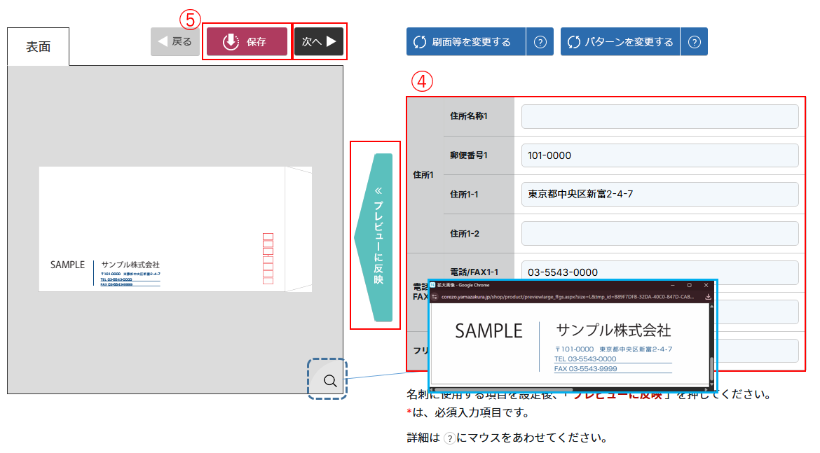 ④編集画面が表示されますので、編集したい項目を入力し、 「プレビューに反映」をクリックします。 ⑤内容を確認の上、「保存」「次へ」の順でクリックします。