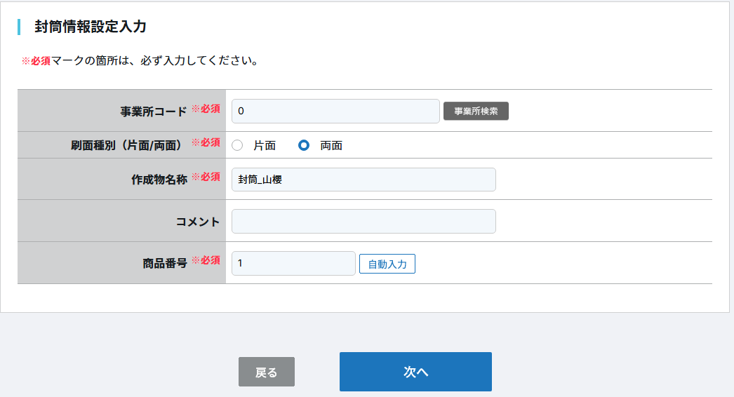 ③商品情報入力の画面が表示されますので、必須項目を入力し、 「次へ」をクリックします。