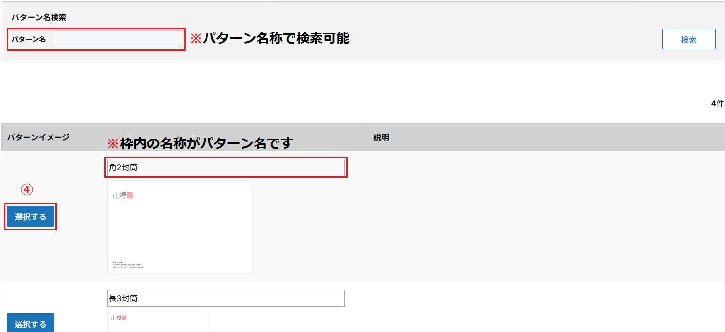 ④パターン一覧の画面が表示されますので、作成したいパターンの「選択する」をクリックします。