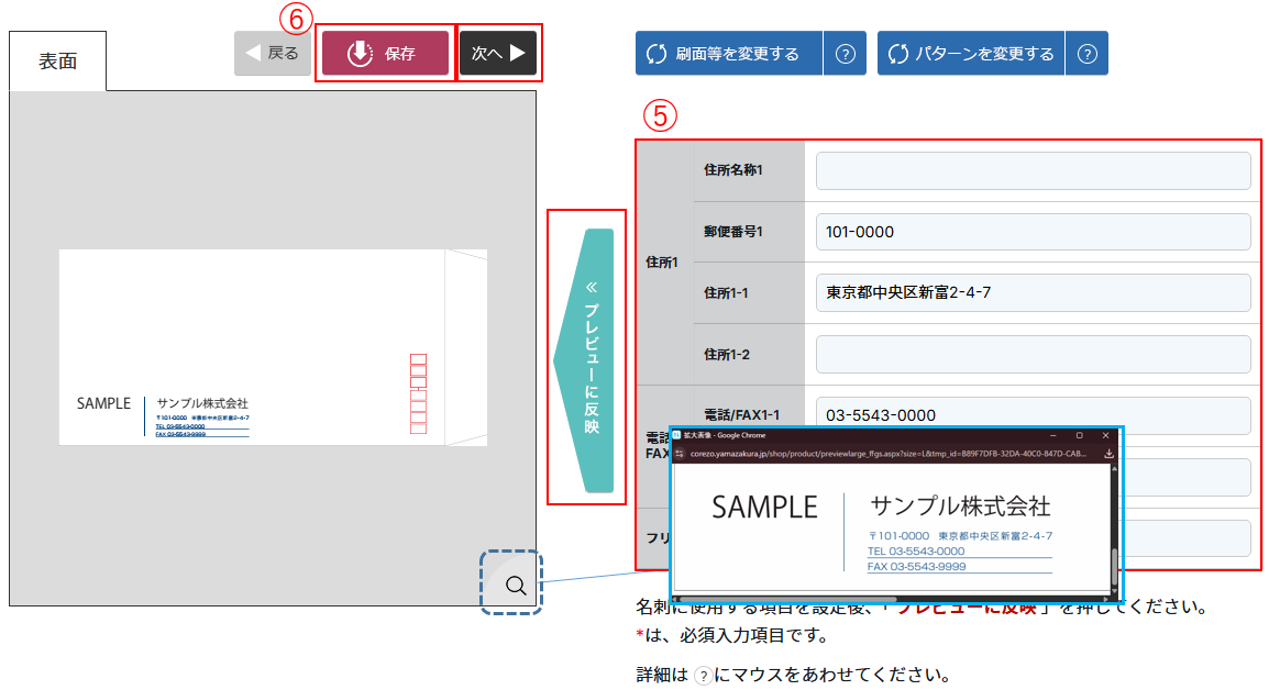 ⑤編集画面が表示されますので、印字したい内容を入力し 「プレビューに反映」をクリックします。 ⑥内容を確認の上、「保存」→「次へ」の順でクリックします。