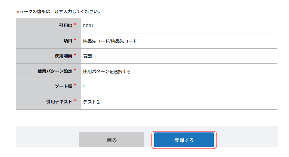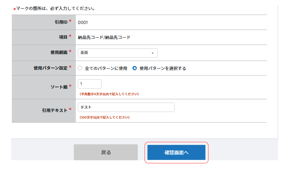 ⑤引用詳細の画面が表示されますので、変更したい項目を修正の上、「確認画面へ」をクリックします。