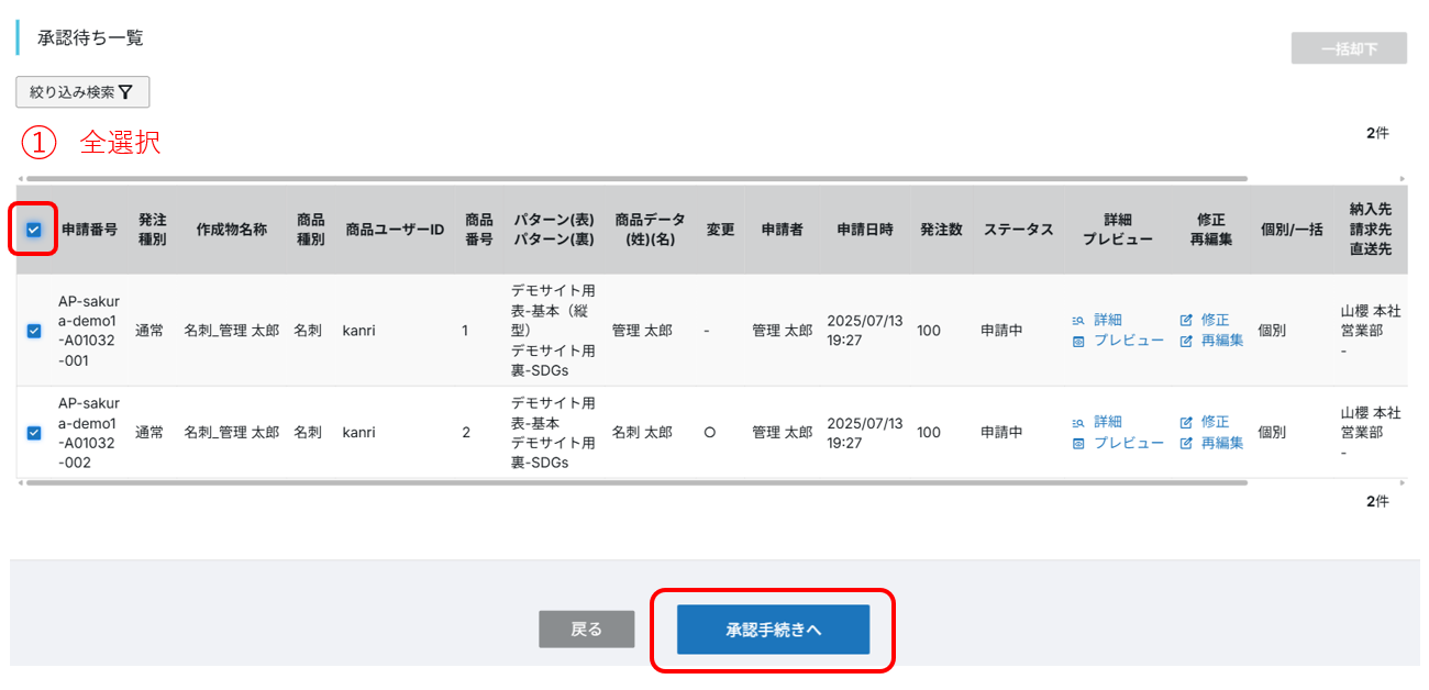 申請を一括承認する申請を一括承認する方法申請データがある場合は承認リスト画面に承認データが表示されています。 ①複数の申請を一括で承認する場合は、承認するデータのチェックボックスにチェックを入れる、もしくは全選択をし、承認手続きに進みます。② 「一括承認」をクリックします。関連コンテンツ承認画面について承認データを確認する発注内容を修正する名刺を再編集する