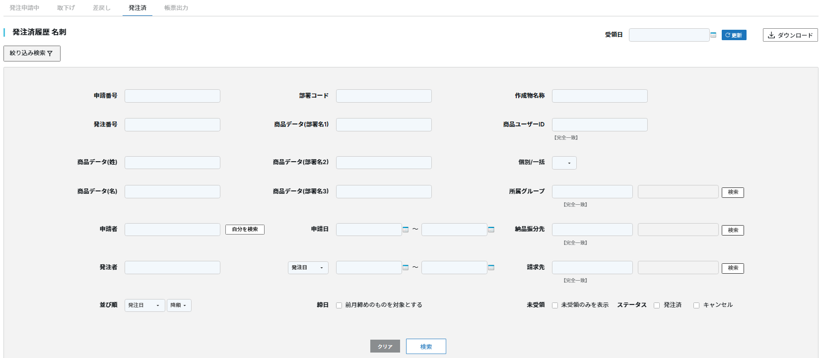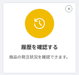 発注履歴をダウンロードする発注履歴をダウンロードする方法①ホーム画面の「履歴を確認する」アイコンをクリックします。②「絞り込み検索」をクリックし、必要項目を入力のうえ、「検索」をクリックします。 ③検索結果が画面に表示されたら「ダウンロード」をクリックします。 関連コンテンツ発注履歴を確認する