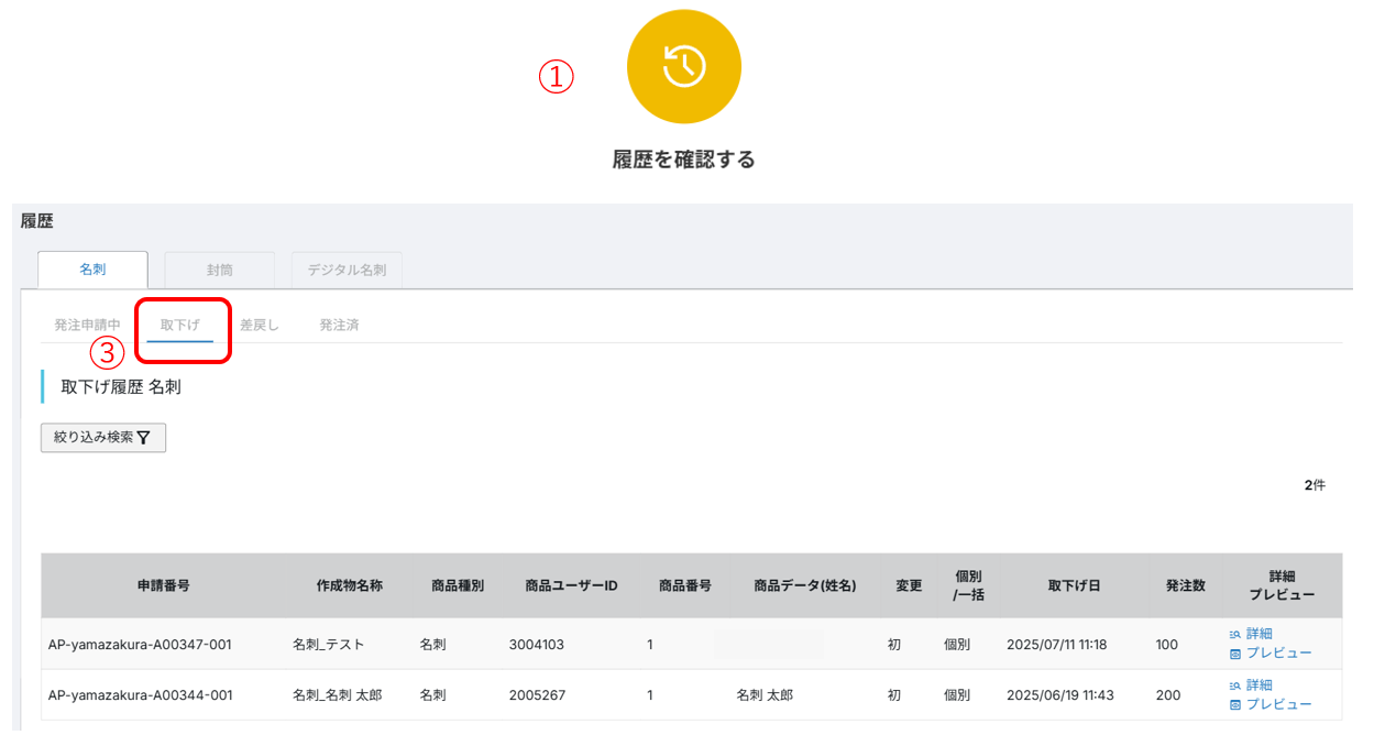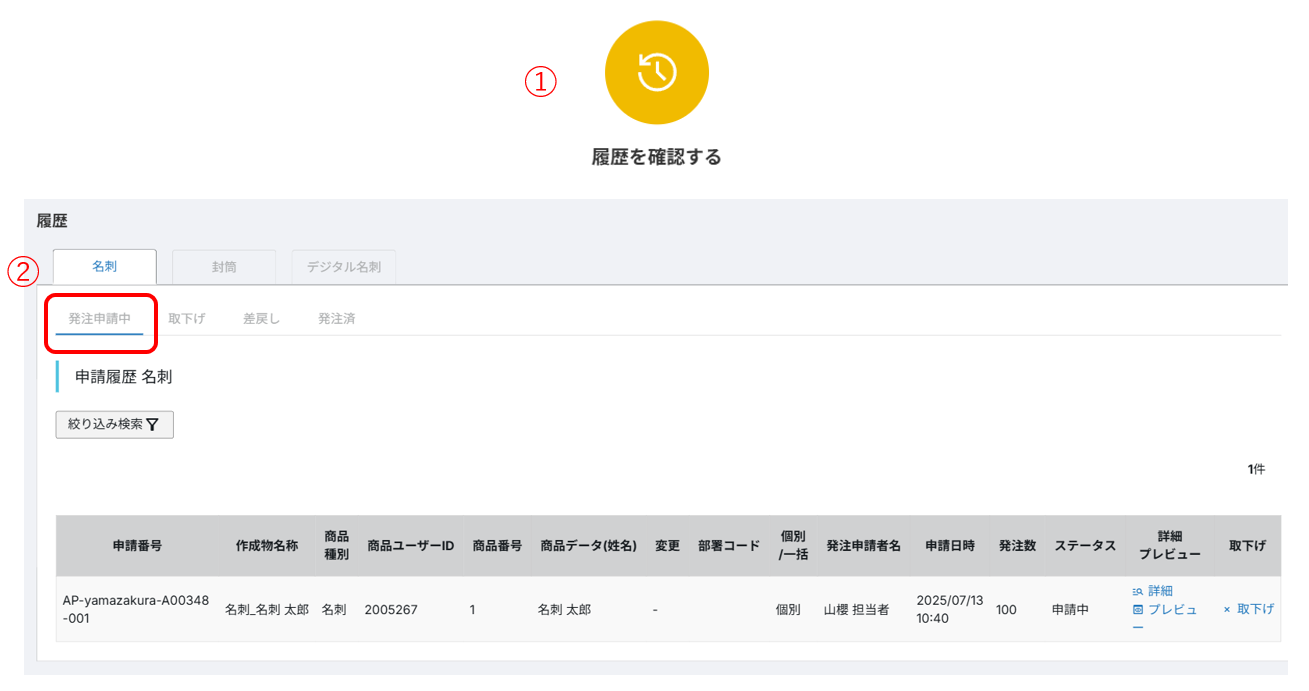 現在、発注申請中の名刺を確認できます。 発注申請を取り下げる場合は 「発注申請の取り下げ(キャンセル)」をご参照ください。 ※発注申請中の履歴に表示されている名刺は発注が完了しておりませんのでご注意ください。