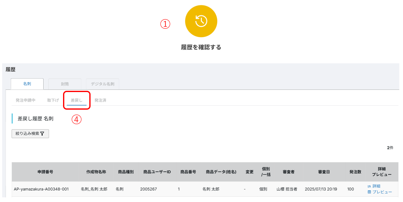 承認者より発注申請が差戻された名刺を確認できます。 差戻しの詳細な情報を確認する場合は 「差戻しされた名刺の詳細情報を」ご参照ください。