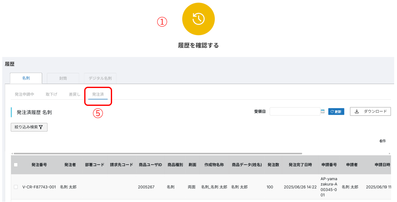 発注申請が承認された名刺を確認できます。 発注済の履歴に表示されている名刺は発注処理が完了済みのため、 申請を取下げ(キャンセル)することはできません。 ※発送予定日は、こちらの履歴から発送予定日の欄をご確認ください。