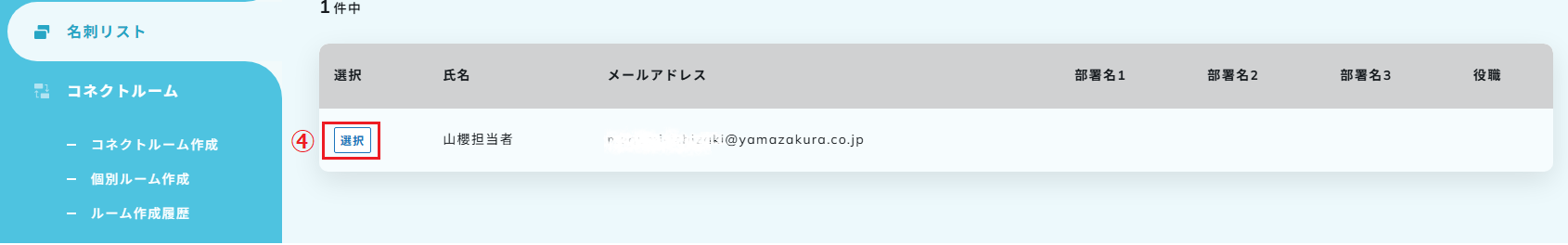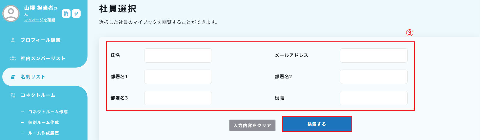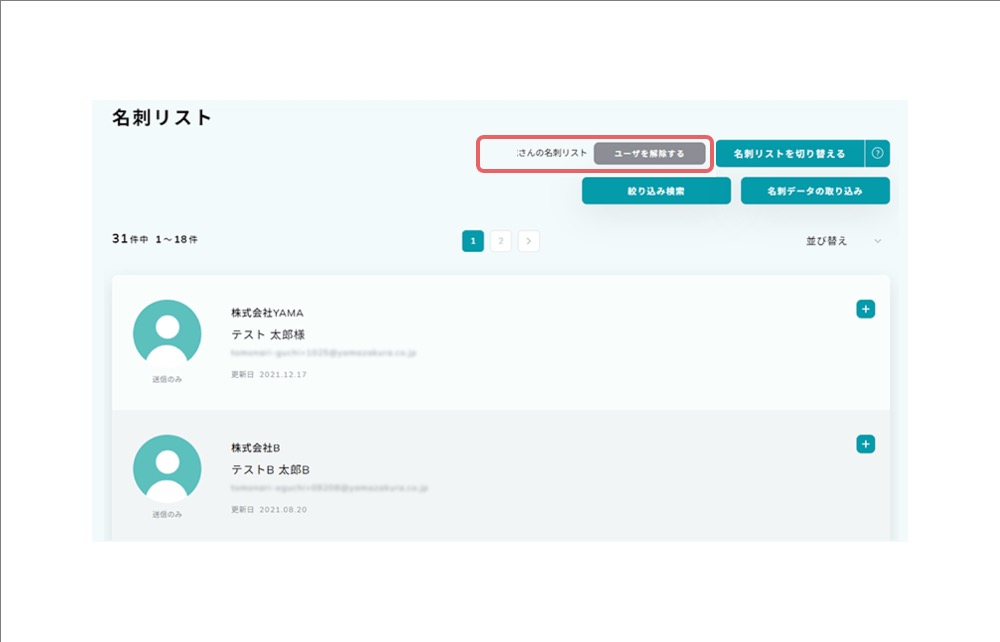 ⑤選択した社員のマイブックが表示されます。 ※「ユーザーを解除する」ボタンをクリックすると、ご自身の名刺リストに戻ります。