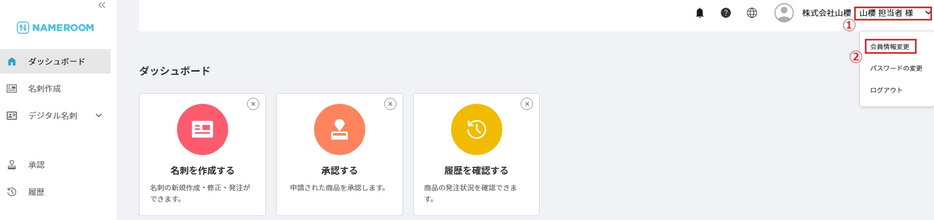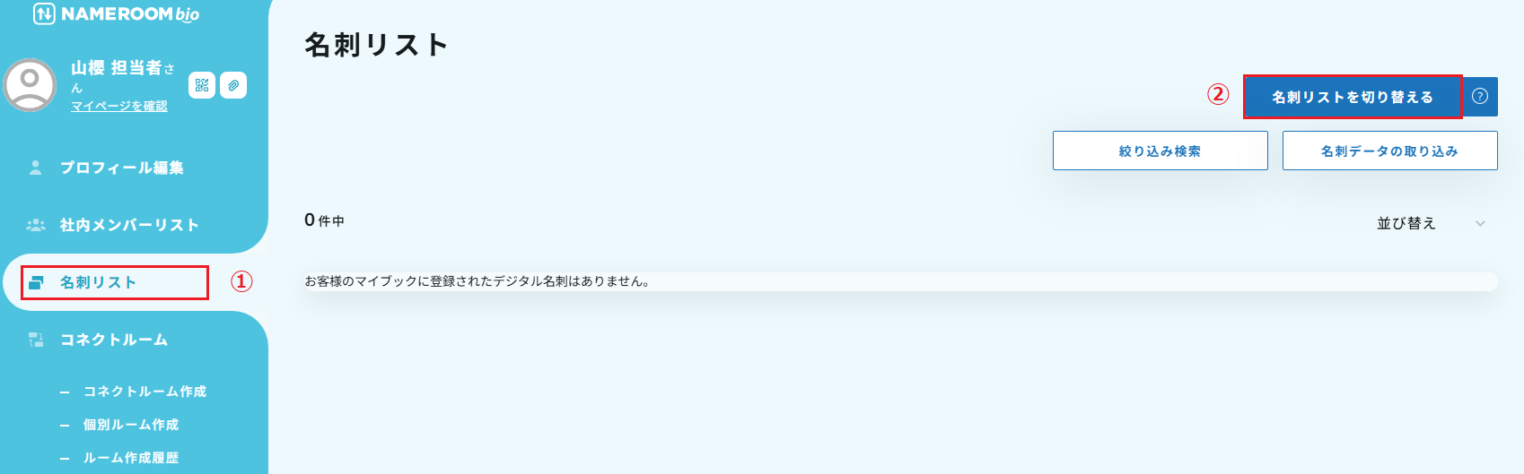 ①NAME ROOMbioのホーム画面の「名刺リスト」をクリックします。 ②画面右上の「名刺リストを切り替える」をクリックします。