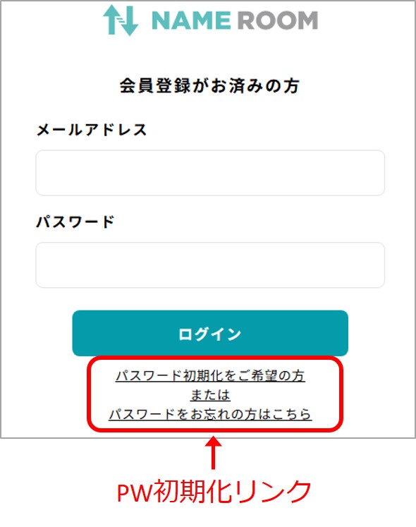 NAMEROOMbioログイン画面からログインする場合にはパスワードが必要になります。初めてログインする場合はPW初期化リンクからパスワードを設定してください。(下図参照)