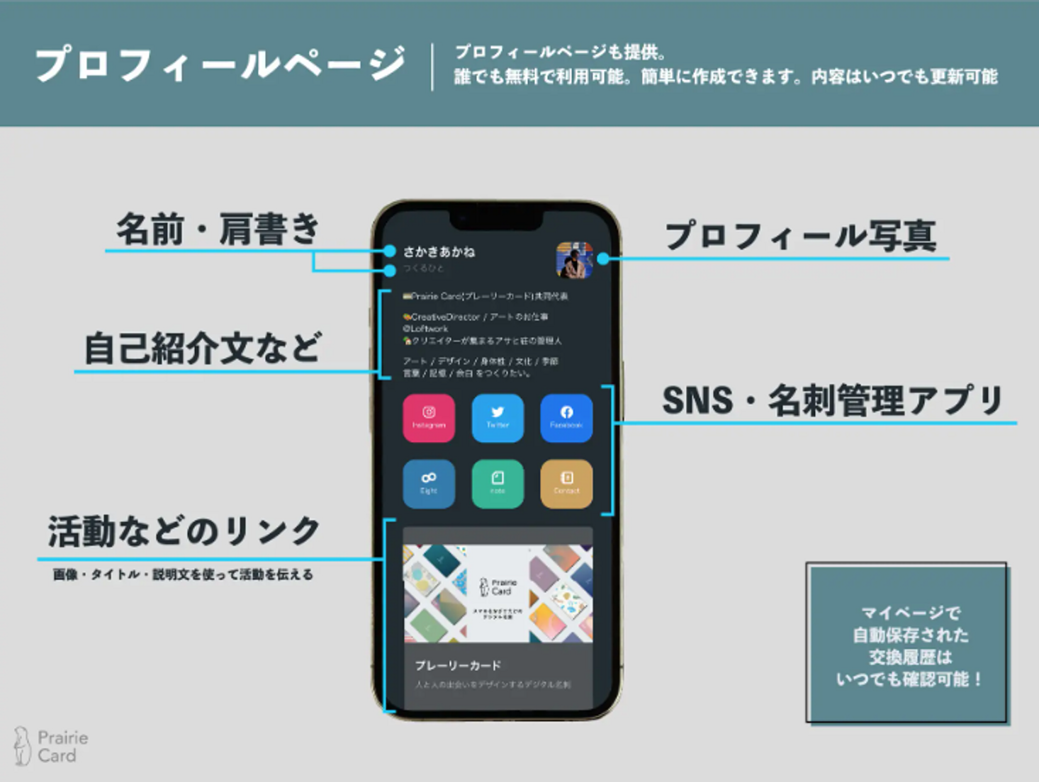 スマホにプレーリーカードをかざすだけで表示されるプロフィールページは、無料で、簡単に、誰でも作成・利用できます。プロフィール写真、肩書き、各SNSをはじめ、任意のURLと画像も設定可能。ポートフォリオサイト・公式サイト・過去の活動・最新のニュースなど、あなただけのプロフィールページを思いのままに作成できます。