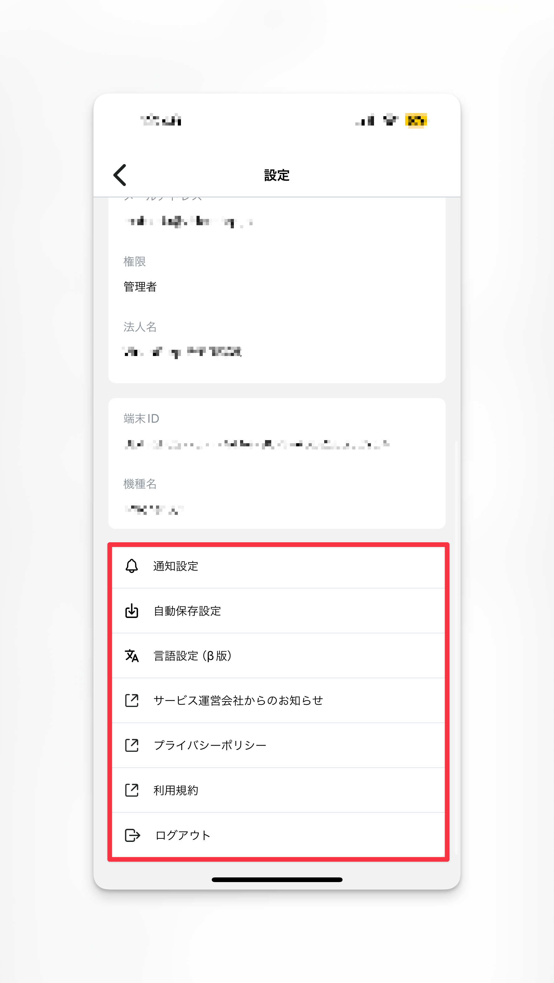 下にスクロールすると、通知設定〜ログアウトの操作を行う画面が表示されます。