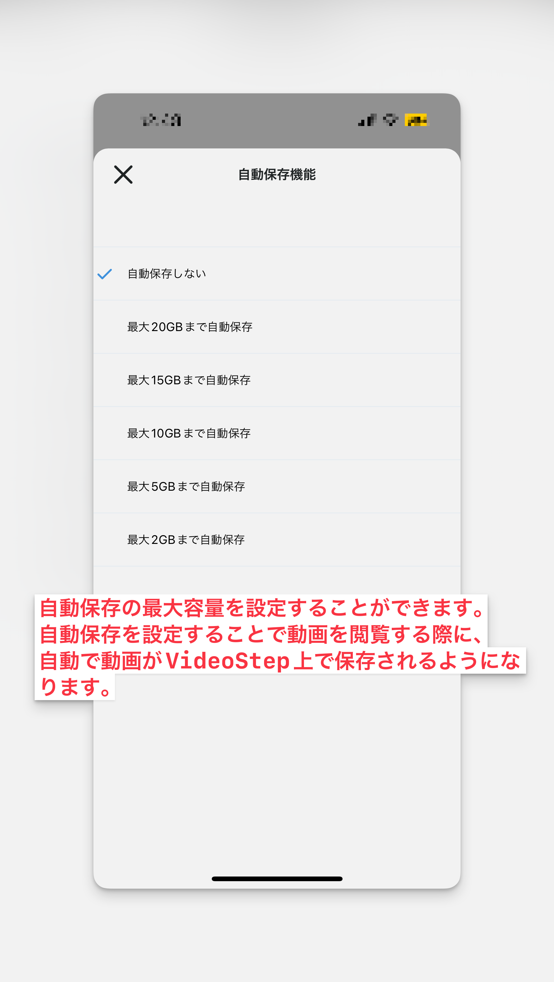 自動保存の最大容量を設定することが可能です。 自動保存を設定することで動画を閲覧する際に、自動で動画がVideoStep上で保存されるようになります。