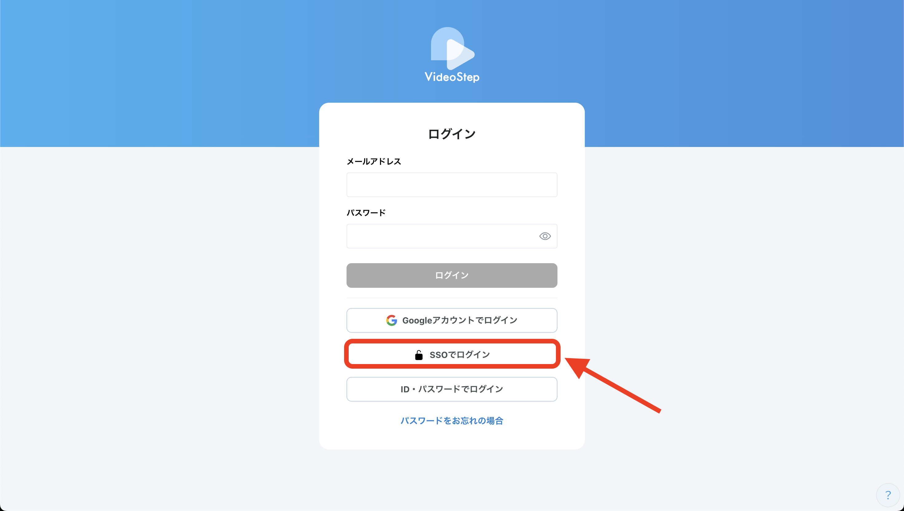 VideoStepでは、シングルサインオン機能を使ってログインすることができます。ワークスペースに登録されているドメインのメールアドレスであれば、VideoStepへのアカウント登録なしでログインすることが可能です。