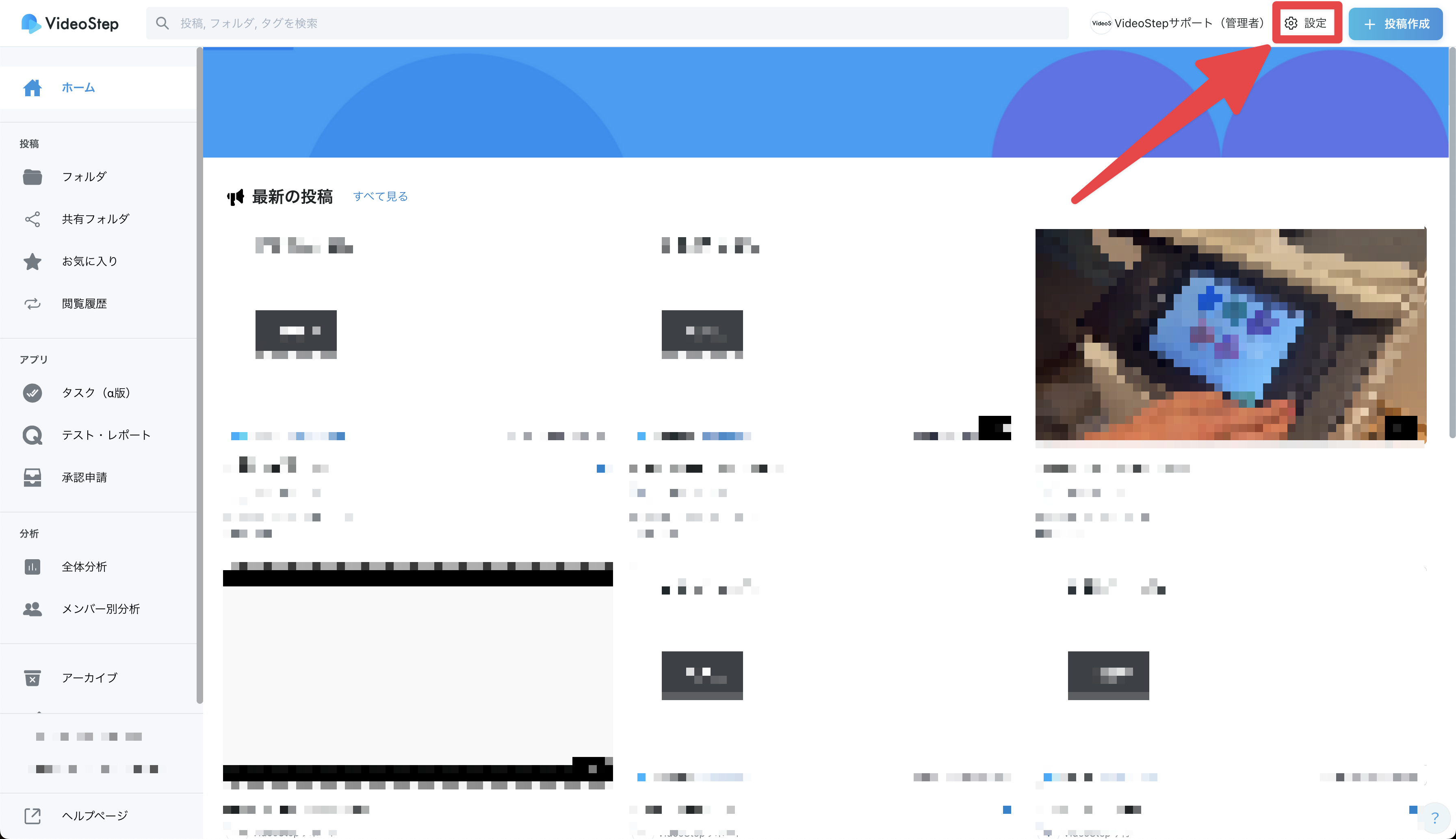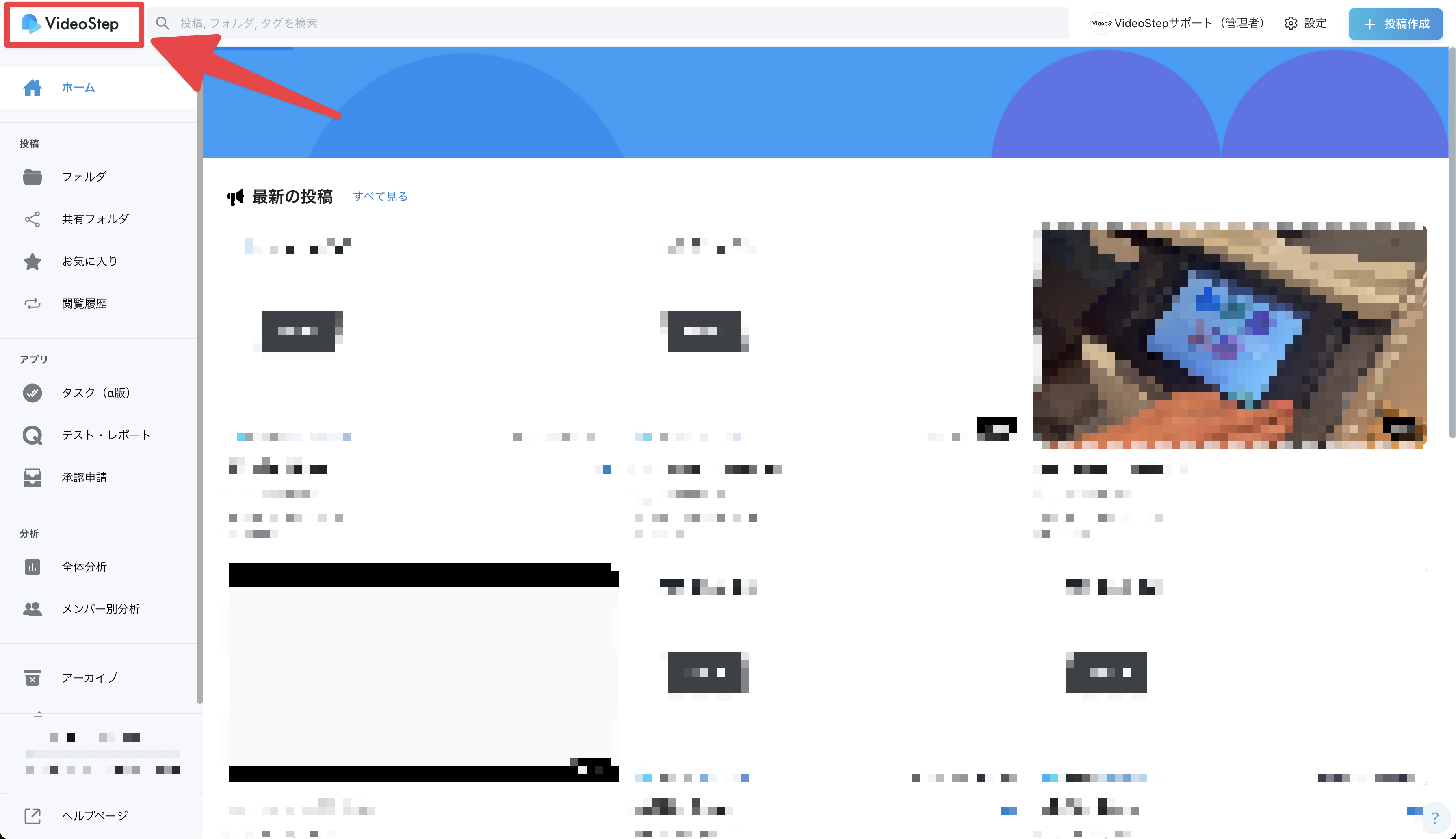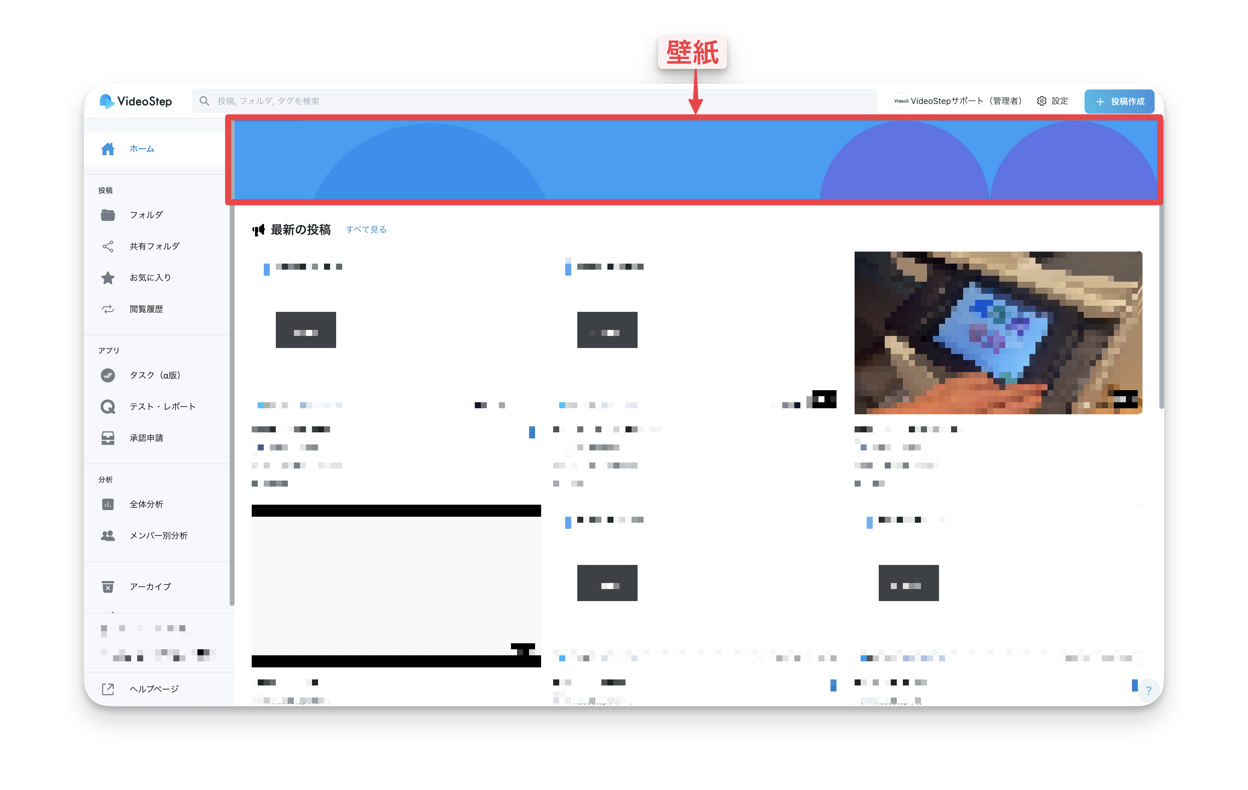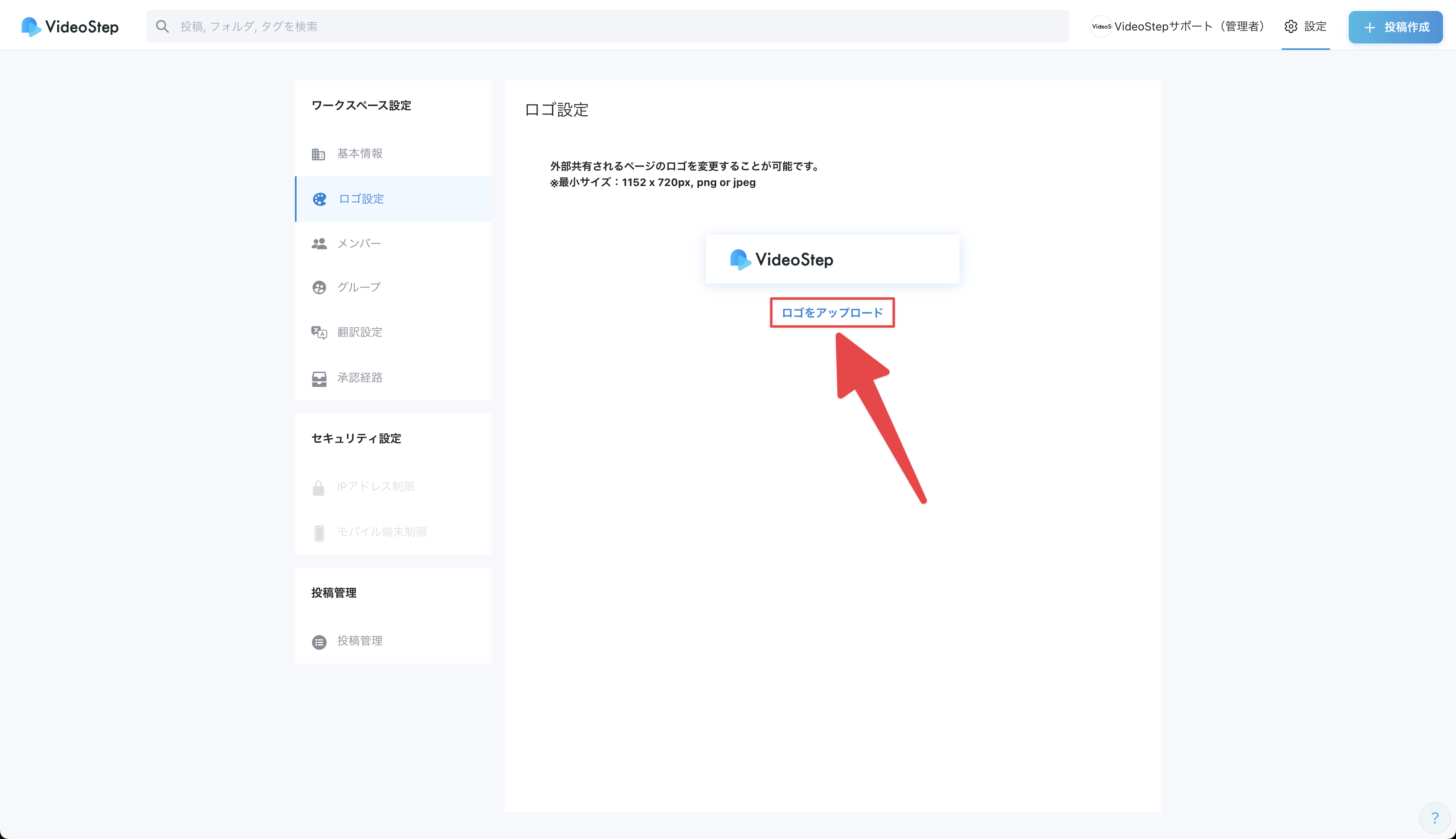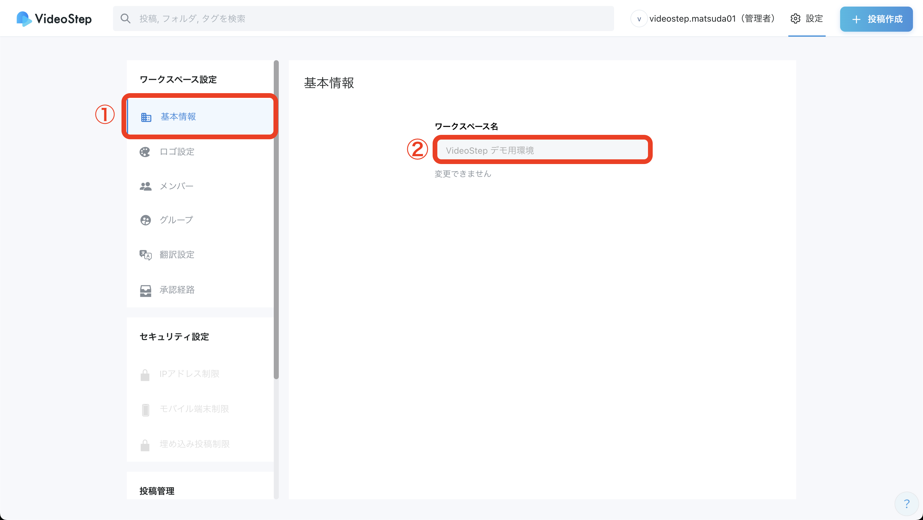 現在ご利用中のワークスペース名が表示されます。 原則として名前の変更はできませんが、 運用担当者様よりVideoStepのサポートへご連絡いただければ、変更が可能です。