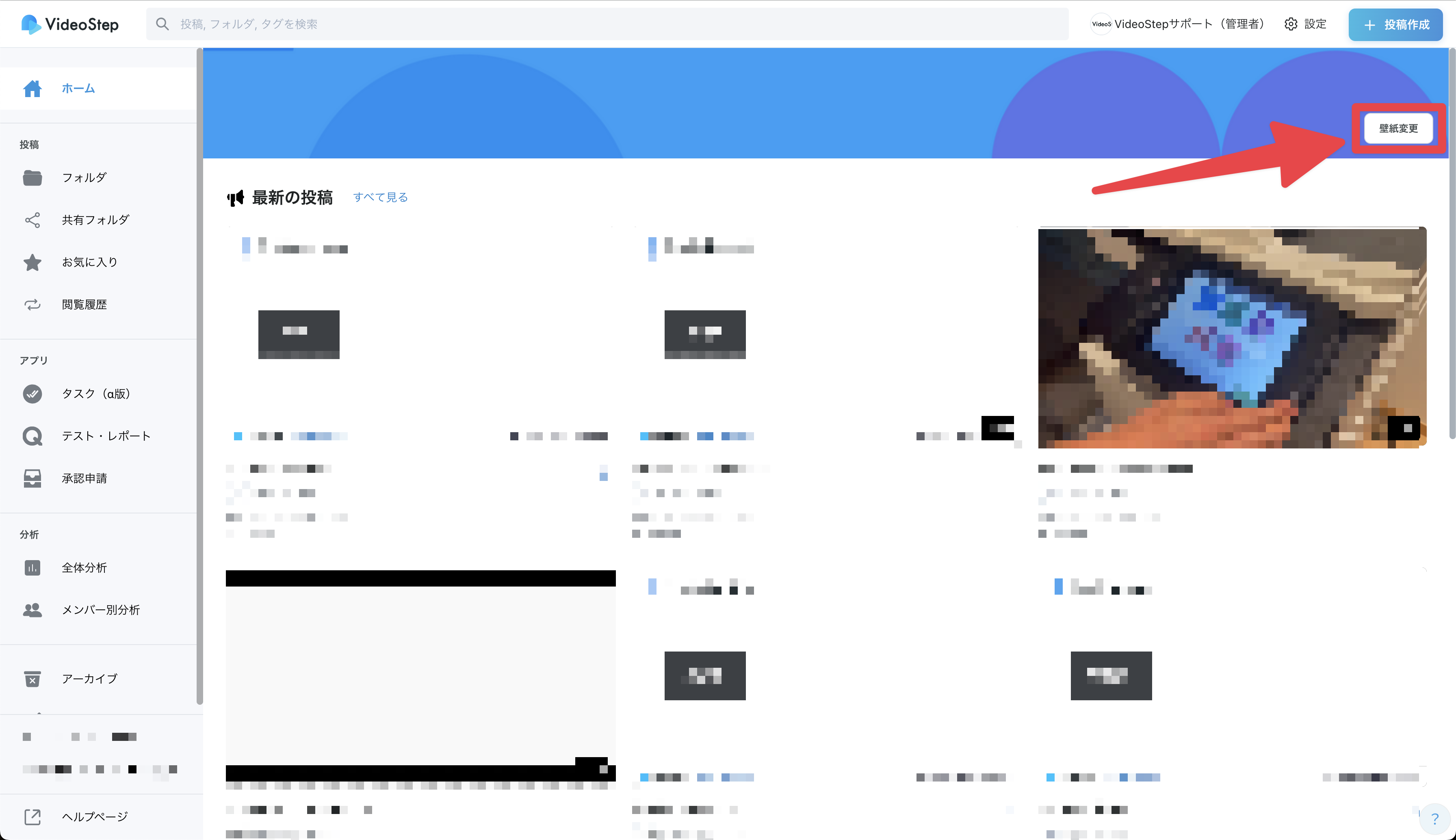 ホーム画面の右上にある「壁紙変更」をクリックし、画像を挿入し、壁紙を変更することができます