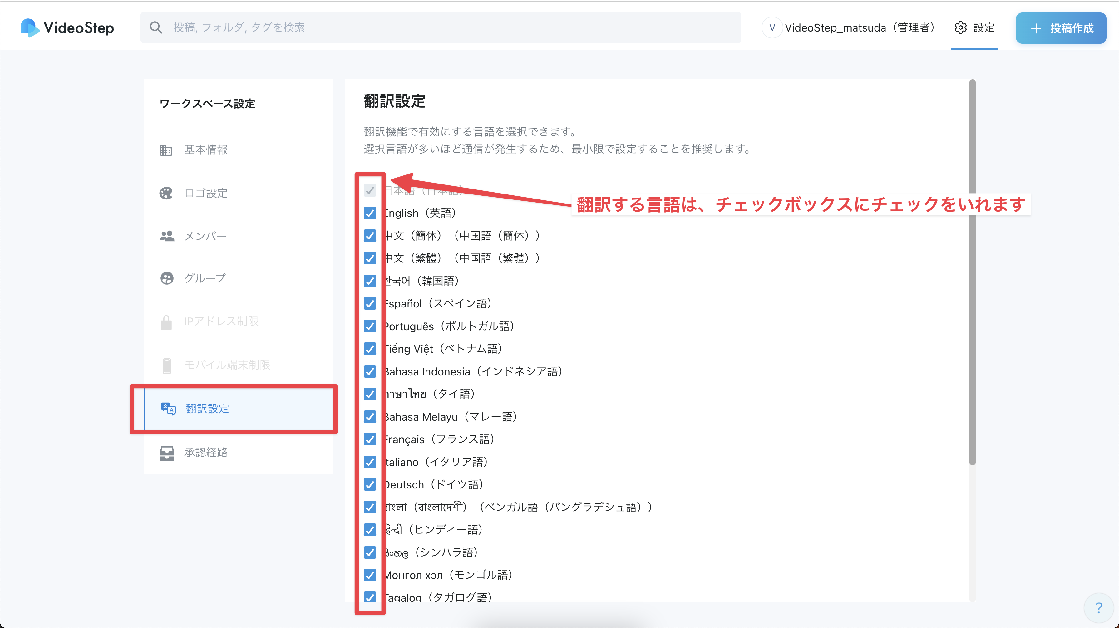 動画の字幕や読み上げを閲覧画面で翻訳するには、ワークスペース設定で翻訳言語を指定する必要があります。