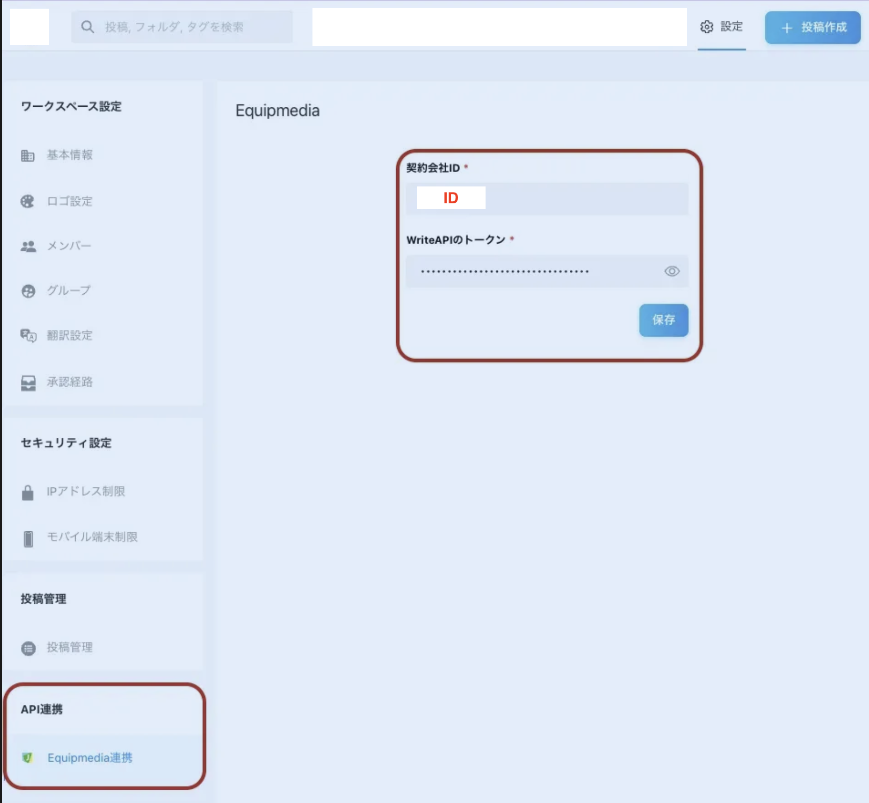 Equipmedia側のダッシュボードに記載されている「契約会社ID」と「WriteAPIのトークン」を入力し、保存ボタンで設定を保存します。