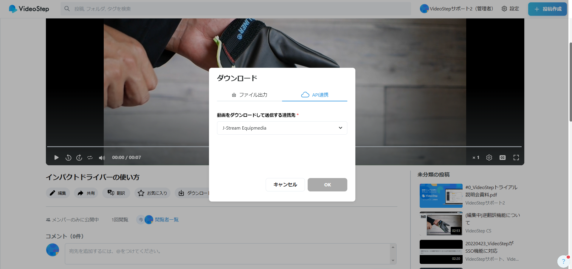 VideoStep上の投稿を、法人向けの動画共有・配信プラットフォームである『J-Stream Equipmedia(EQ)』内で共有することができます。