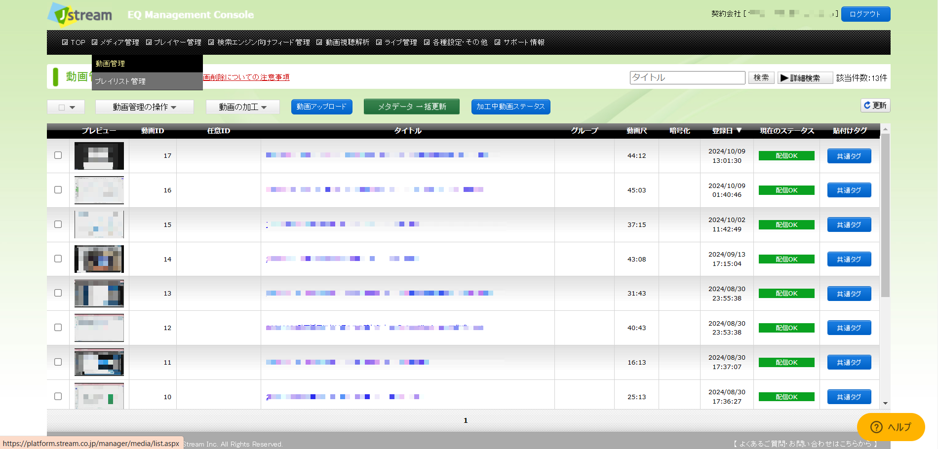 「J-Stream Equipmedia」の画面左上部にある「メディア管理」から「動画管理」を選択すると、VideoStep上で作成された動画がEQ上にアップロードされていることが確認できます