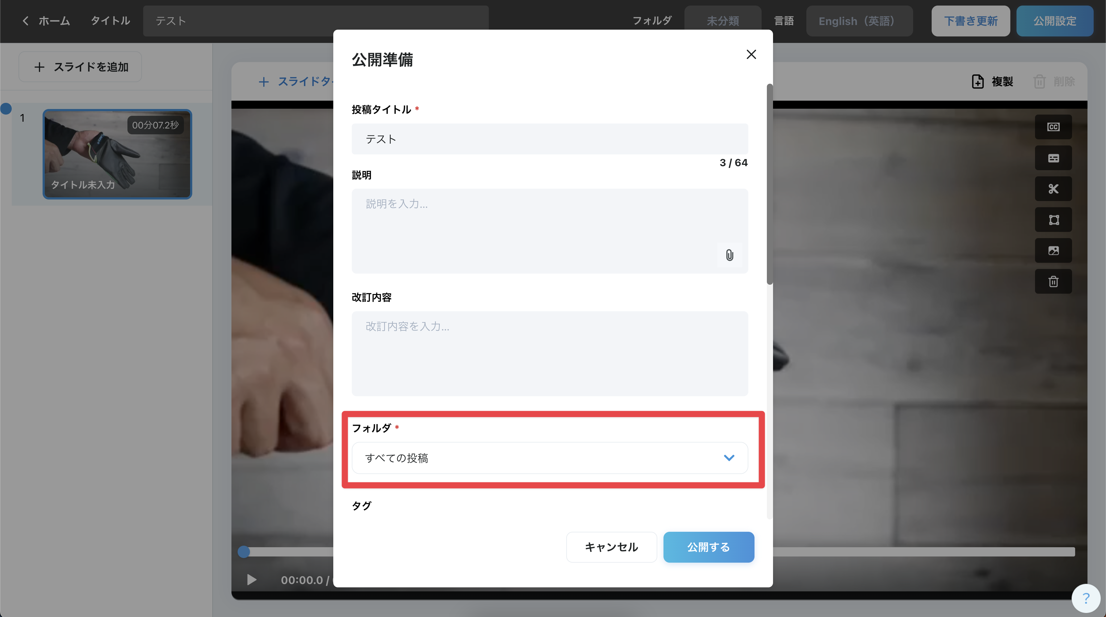 投稿公開ダイアログ 内、「フォルダ」で希望のフォルダをプルダウンで選択