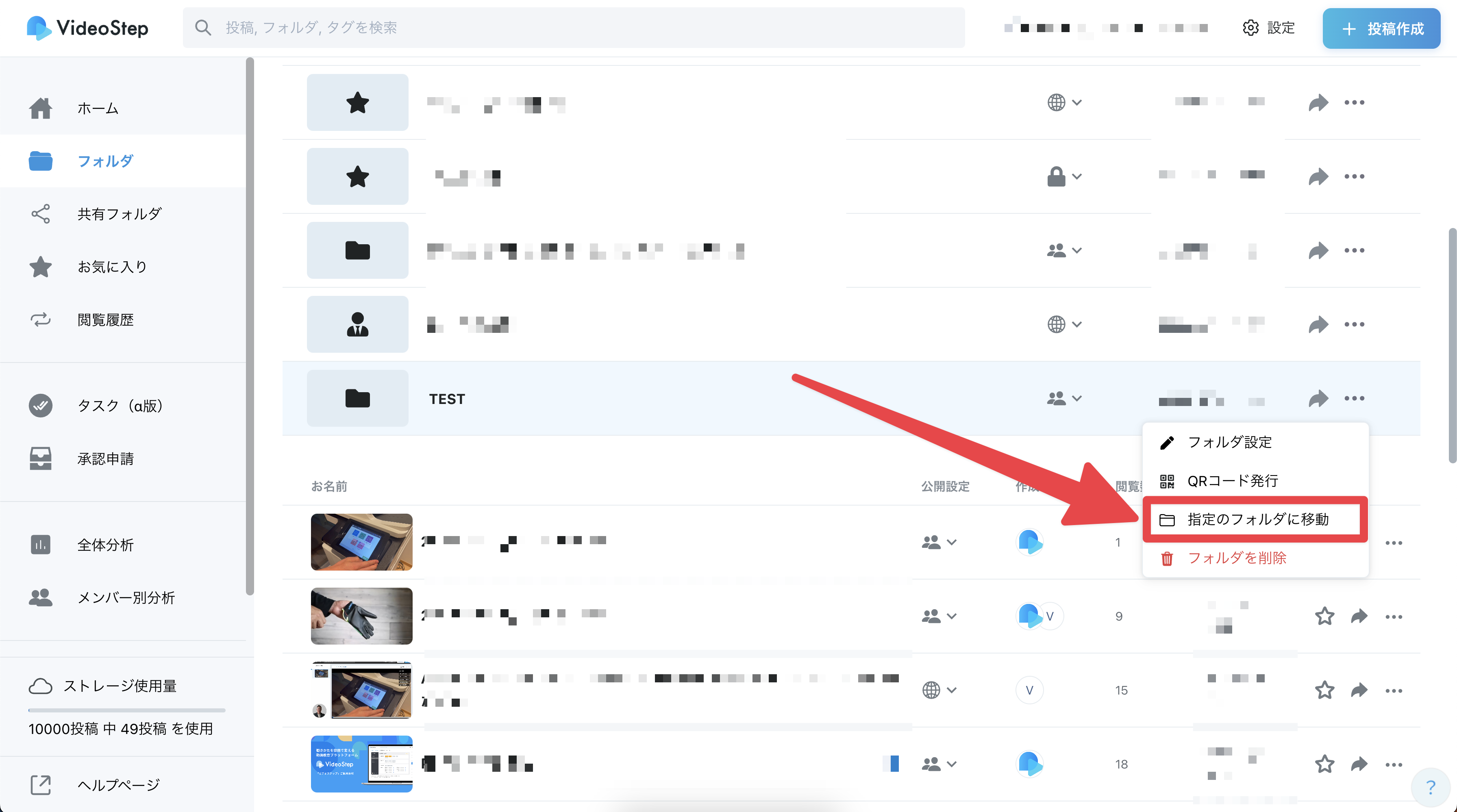 ホーム画面左側にある「フォルダ」から、投稿の右側にある「指定のフォルダへ移動」を選択する