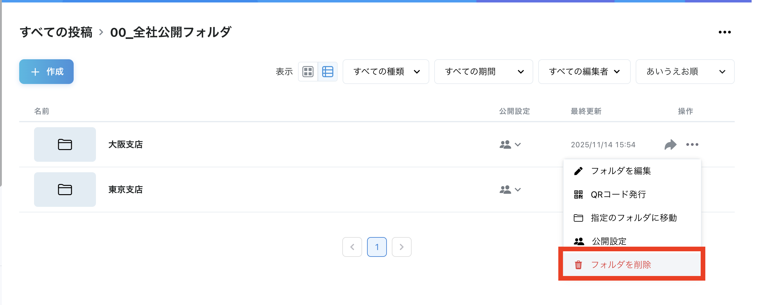 削除するフォルダの右側の3点リーダーをクリックする。