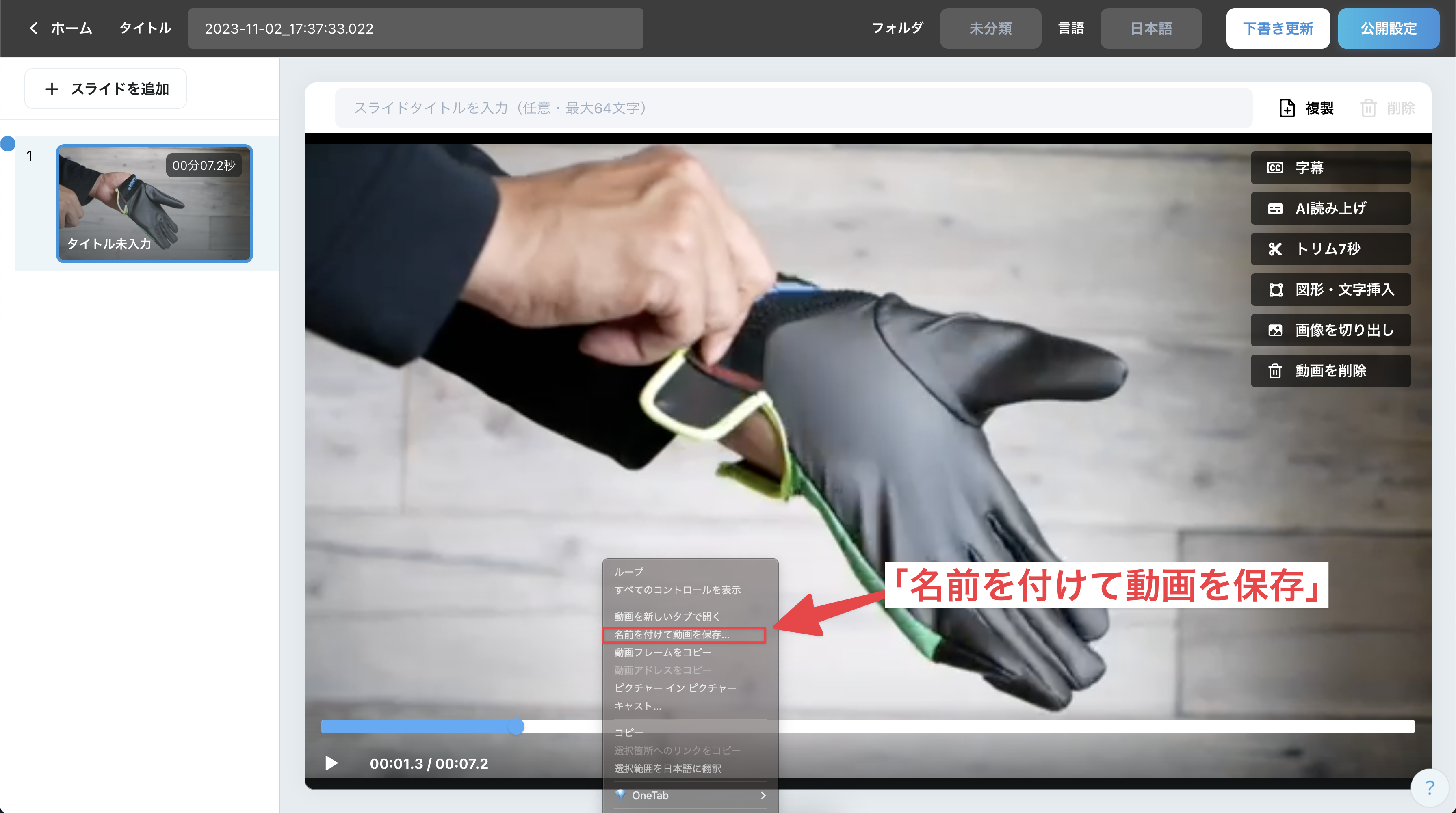 編集画面で対象スライドを右クリック → 名前を付けて動画を保存