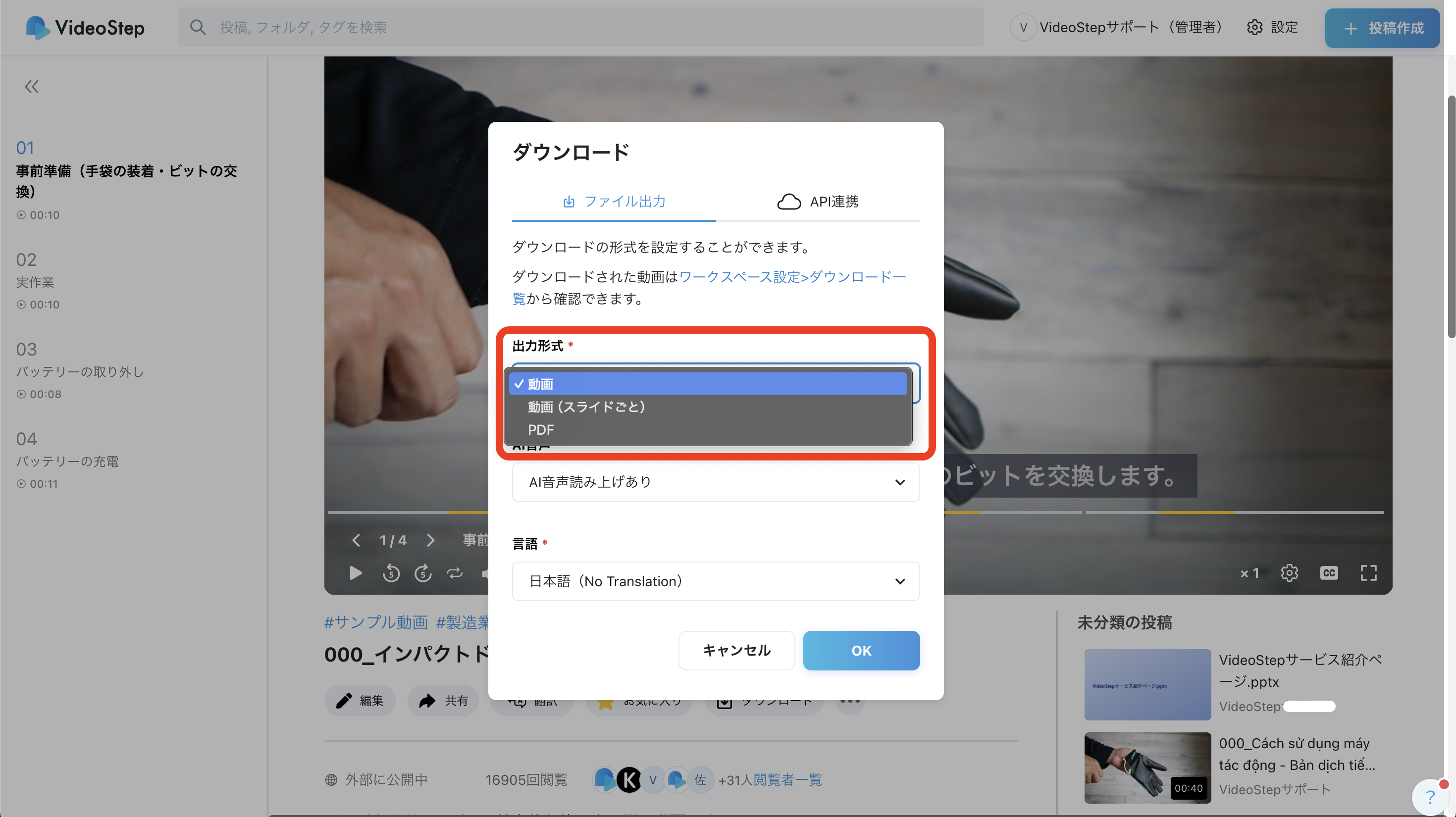 出力形式を選択動画:動画(一括)|動画(スライド毎)|PDF