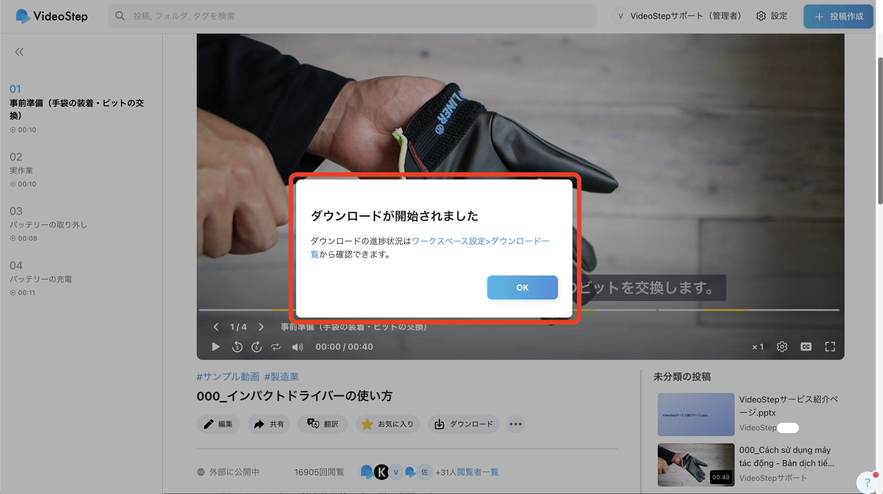 ワークスペース設定 → ダウンロード一覧 で進捗確認