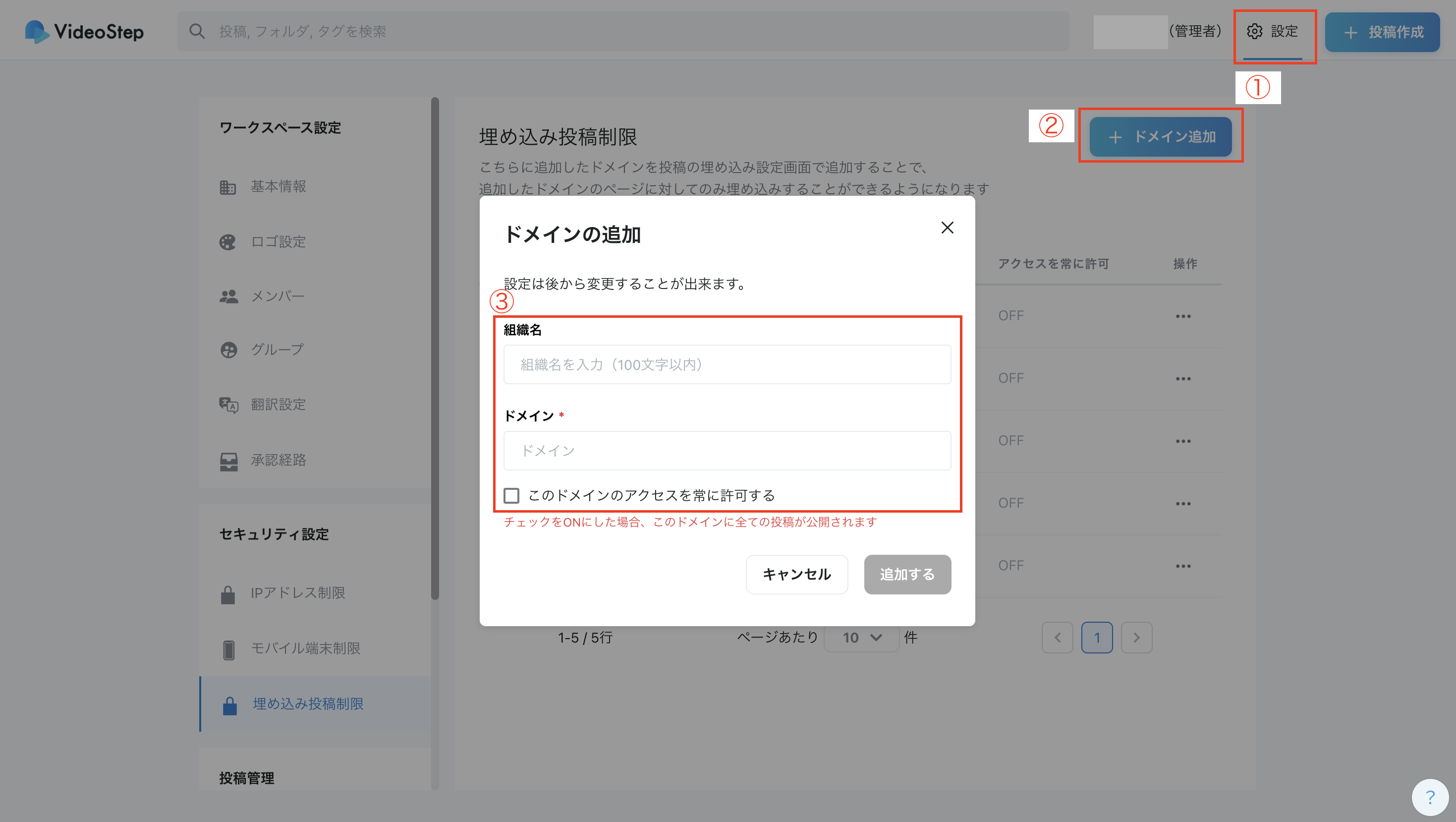 ãã¡ã€ã³è¿œå ã®ç»é¢ã§çµç¹åãšãã¡ã€ã³ãå ¥åããŠã远å ããããã¿ã³ãã¯ãªãã¯ããŸãã â»è¿œå ãããã¡ã€ã³ã«å šãŠã®æçš¿ãå ¬éããå Žåã«ã¯ãããã®ãã¡ã€ã³ã®ã¢ã¯ã»ã¹ãåžžã«èš±å¯ãããã«ãã§ãã¯ãå ¥ããŸãã