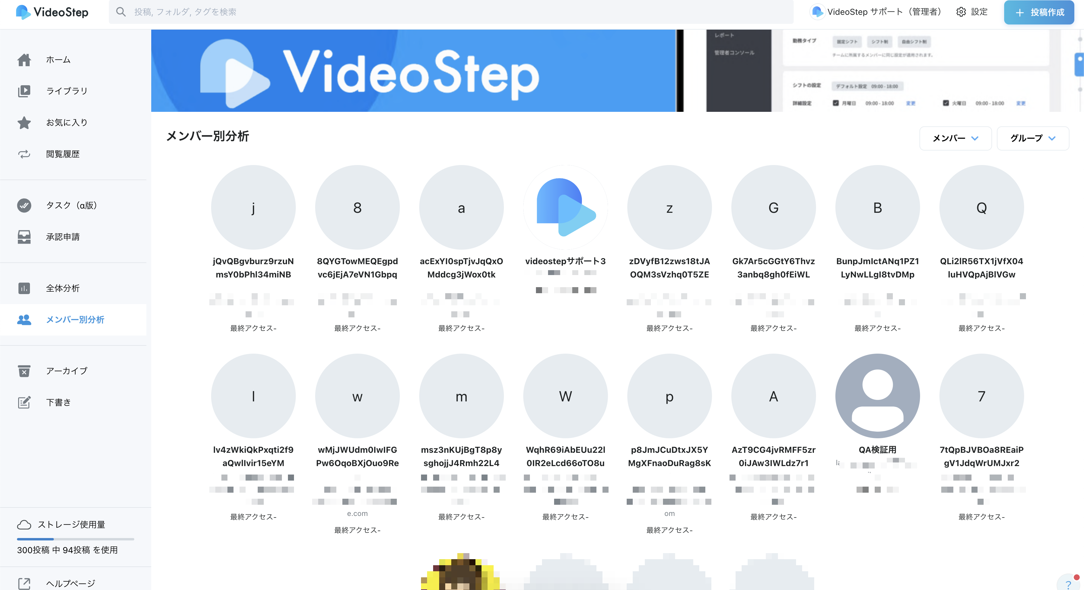 VideoStepã®äœ¿çšç¶æ³ããã¡ã³ããŒãã°ã«ãŒãããšã«è©³çްãªããŒã¿ã§ç¢ºèªããããšãã§ããŸãã 以äžã®æ å ±ã確èªããããšãã§ããŸãã