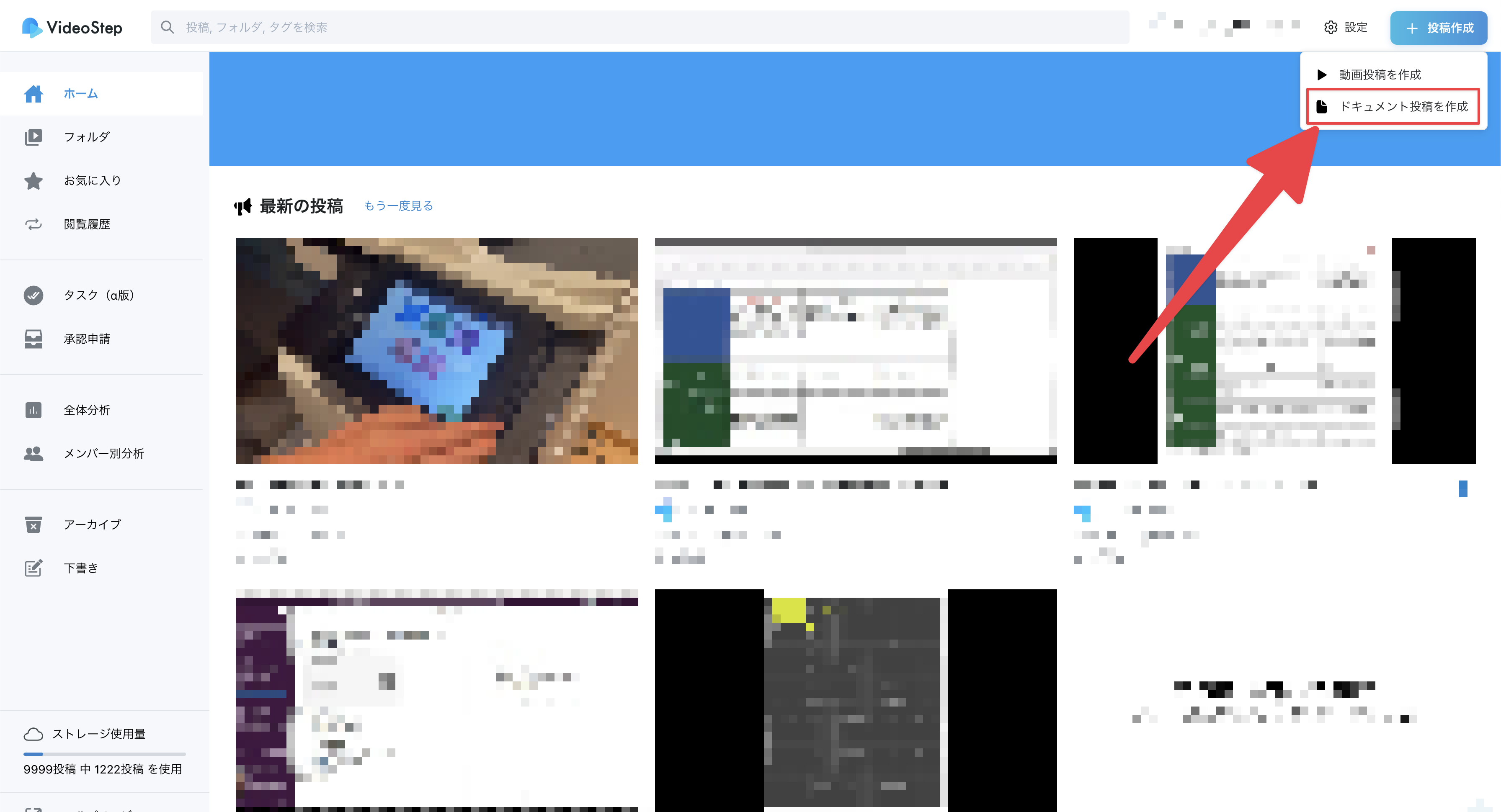 ホーム画面の右上にある、「投稿作成」から「ドキュメント投稿を作成」を選択します。