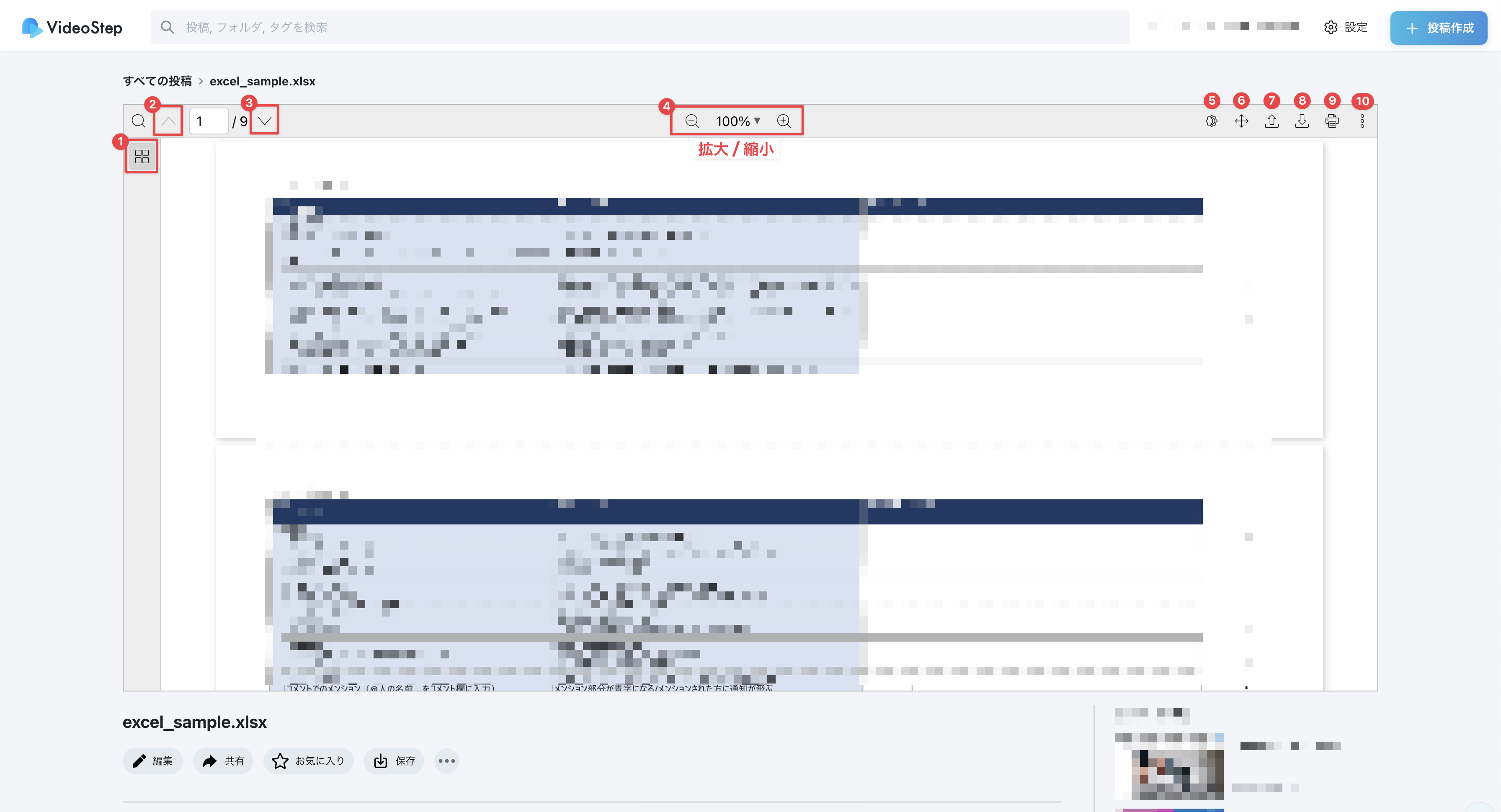 ①サムネイル表示 ②ページ戻る ③ページ進む ④拡大/縮小 ⑤ダークモード/ライトモード ⑥全画面表示 ⑦ファイルを開く ⑧ファイルをダウンロードする ⑨印刷 ⑩その他のアクション