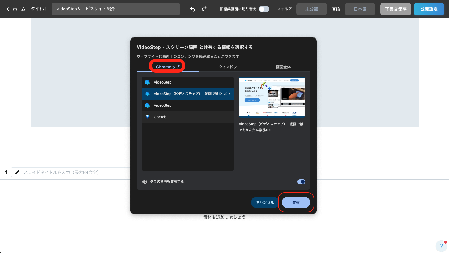 録画する画面を選択するウィンドウが表示されます。録画したい画面を選び、[共有]をクリックしてください。[共有]をクリックすると録画が開始されます。※システム音声も共有する場合は、[タブ]を選択してください。