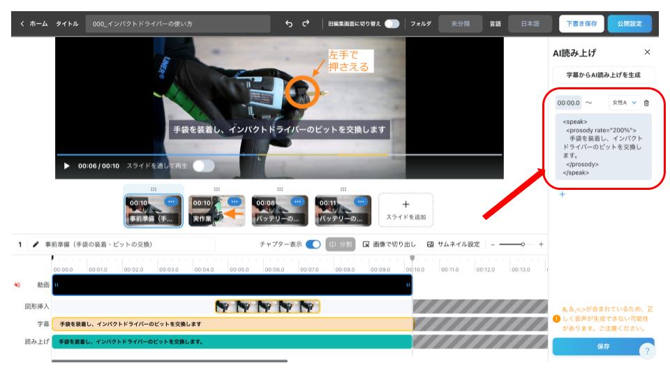 VideoStep の AI 読み上げは SSML(Speech Synthesis Markup Language)に対応しています。SSML を使って読み上げ速度を調整できます。※ 音声選択機能(男性 A/B ボイス切替)と SSML 設定は同時利用できません。