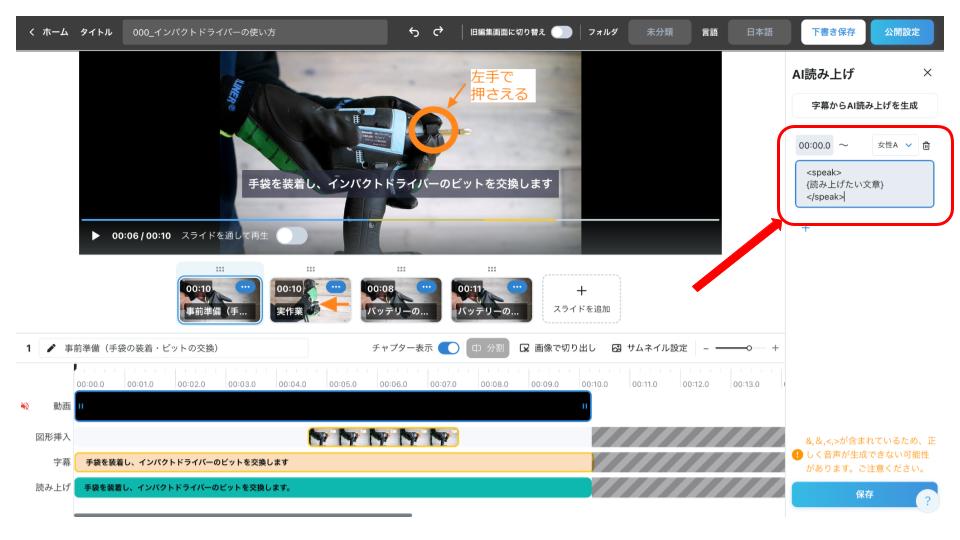 AI読み上げ設定画面にて、文章の最初と最後を