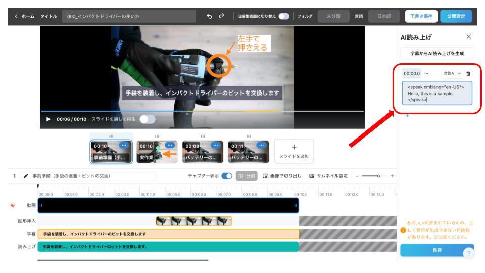 </speak>VideoStep の AI 音声読み上げは SSML(Speech Synthesis Markup Language) に対応しています。SSML タグで言語・声質・アクセントなどを指定することで、翻訳を介さず原文どおりに読み上げ可能です。例(英語):