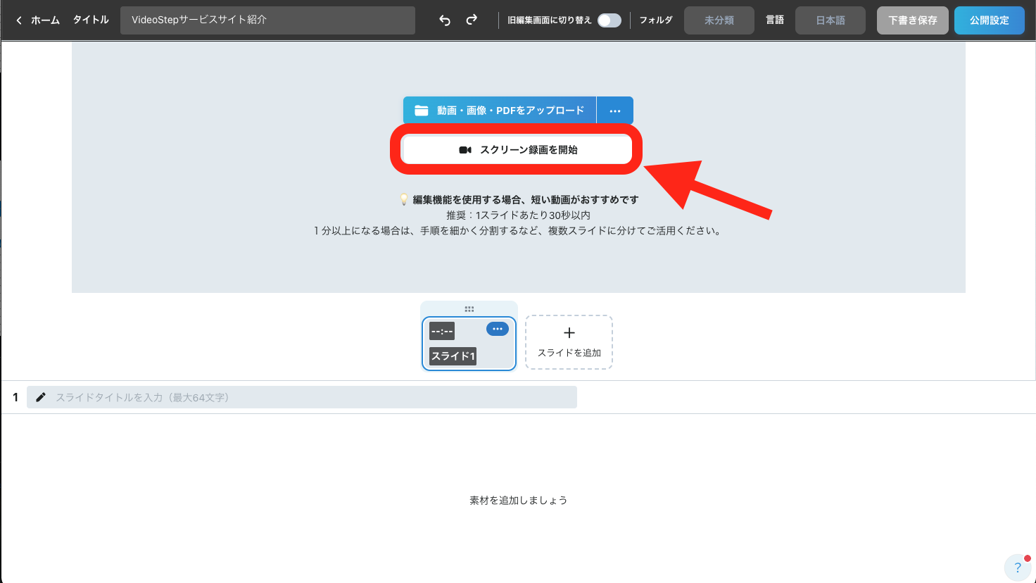 編集画面で [スクリーン録画を開始] をクリックします。