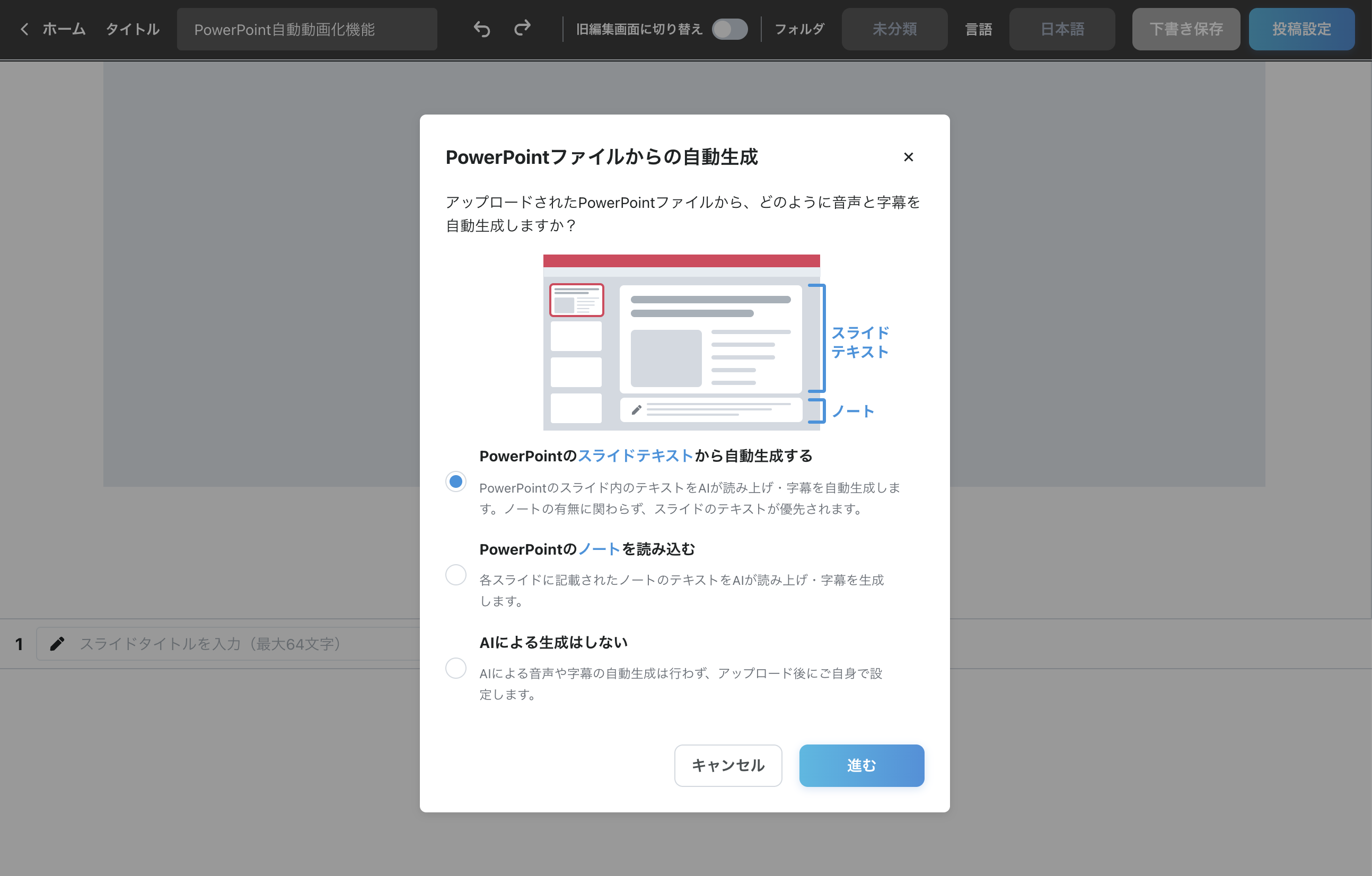 「スライドテキストから自動生成する」機能はオプションプラン です。利用をご希望の場合はサポート担当までお問い合わせください。