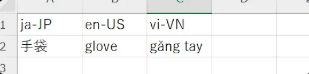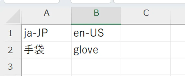 言語コードを1列目に入力したら、2列目以降に実際の単語を記入します。例:日本語「手袋」 ⇄ 英語「glove」※ 双方向(日本語→英語/英語→日本語)に反映させたい場合は、