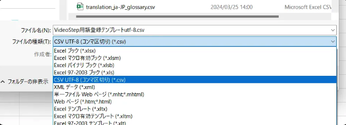 なお、文字化け防止のため、必ず「CSV UTF-8(コンマ区切り)」で保存してください。(特に Windows 環境では、ベトナム語などの特殊文字が文字化けする場合があります)