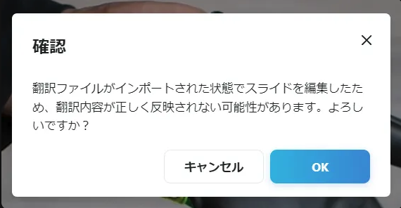 元の言語の字幕を修正する以外に、下記のような操作をした場合に上記の確認メッセージは表示されます。