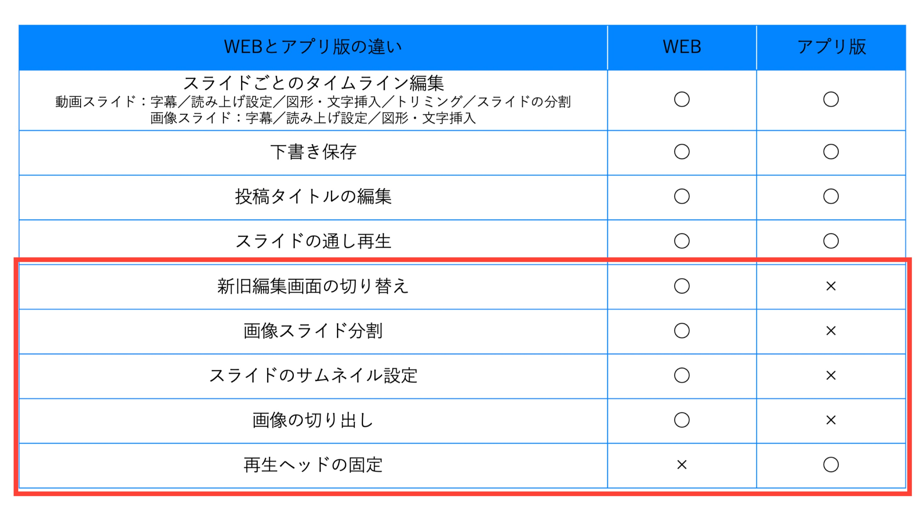 なお、下記の通りにWeb版とアプリ版で対応している機能が一部異なります。