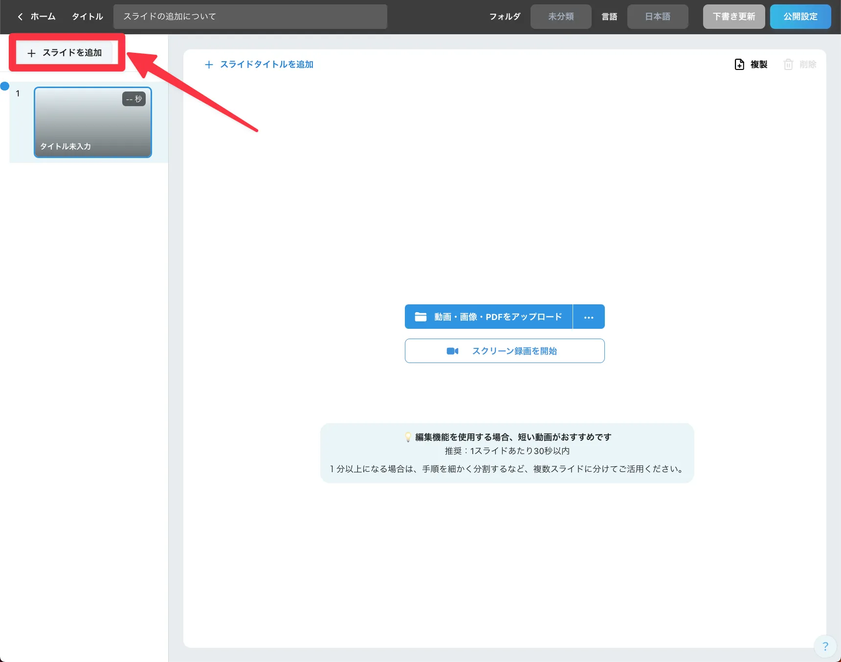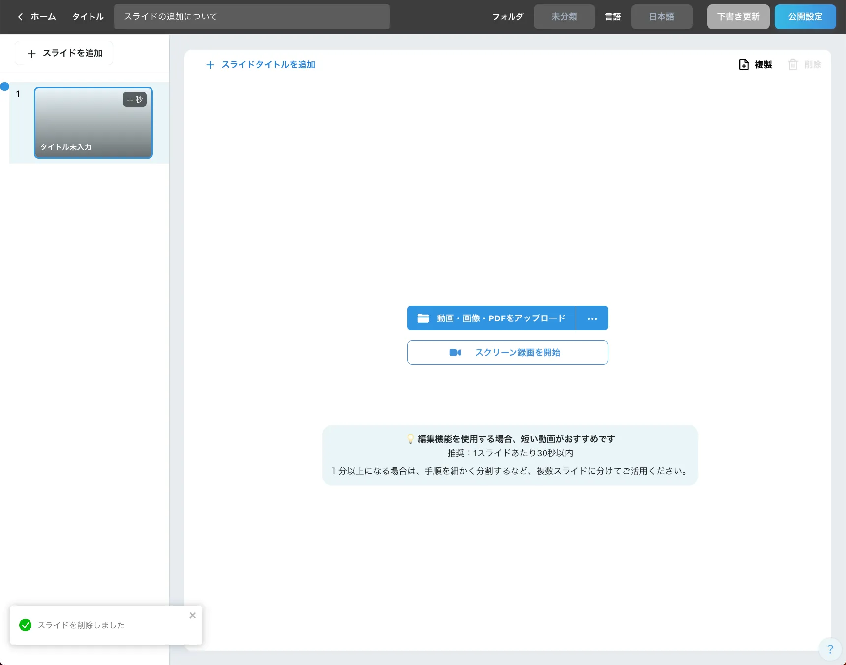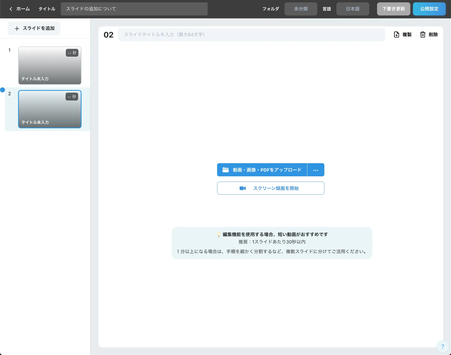 左側にスライドが追加されます。各スライドに動画・画像をアップロードし編集します。公開後は、複数スライドを通しで閲覧できます。